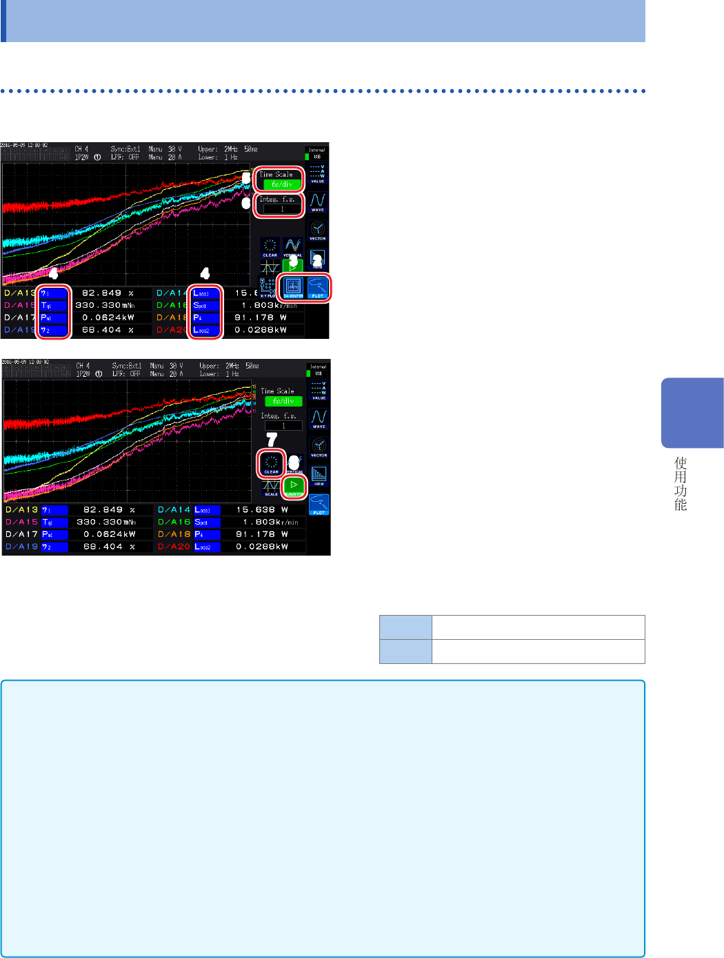 128 简易图形化功能 详细显示设置 可按 D/A 输出项目进行绘制数据的显示 / 不显示设置、纵轴转换比的 MAX 值 /MIN 值设置。图形绘制 区域的上端为 MAX 值,下端为 MIN 值。 2 3 4 1,5 1 触摸 VERTICAL 详细显示设置窗口打开。 进行显示的 ON/OFF 设置时 2 按 D/A 输出项目触摸 ON/OFF 进行切换 ON 显示绘制数据 OFF 不显示绘制数据 设置纵轴转换比时 3 触摸 Scale…