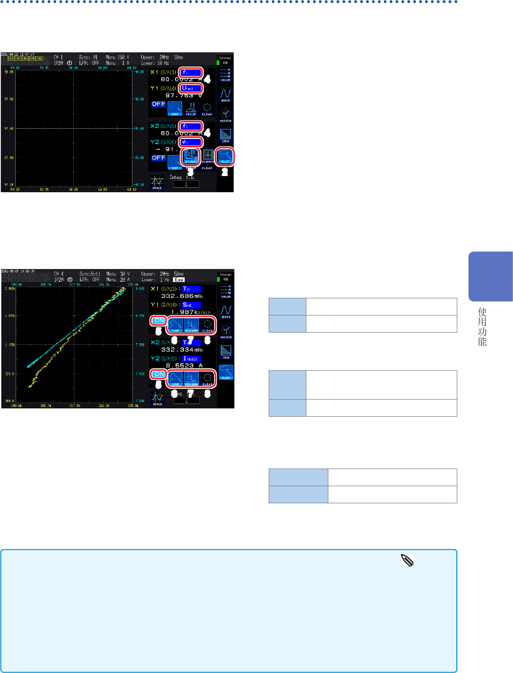 129 简易图形化功能 X-Y 绘制功能 可从基本测量项目中选择 X 轴 (横轴) 与 Y 轴 (纵轴) ,绘制简易的 X-Y 图形。 可同时绘制 2 组图形。 3 2 4 4 1 按下 [MEAS] 键 2 触摸 PLOT 3 触摸 X-Y PLOT 4 选择显示项目 选择 X1 、 Y1 、 X2 、 Y2 这 4 个项目。 可进行 X1-Y1 与 X2-Y2 共计 2 组的图形显 示。 • X1-Y1 图形 X1 轴的刻度显示 :…