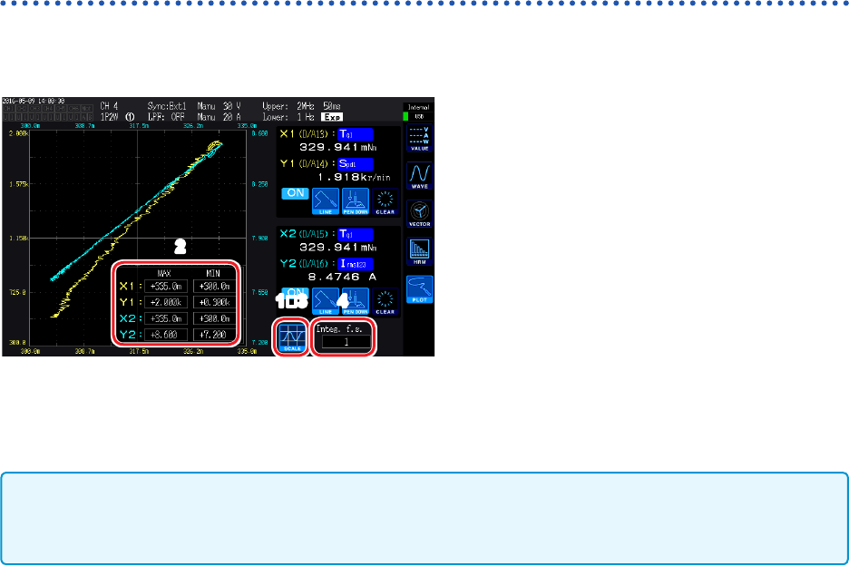 X-Y图形中的 Integ. f.s. (累计满量程)与 D/A 输出项目(第 169页)中的累计满量程或 D/A 监视图形(第