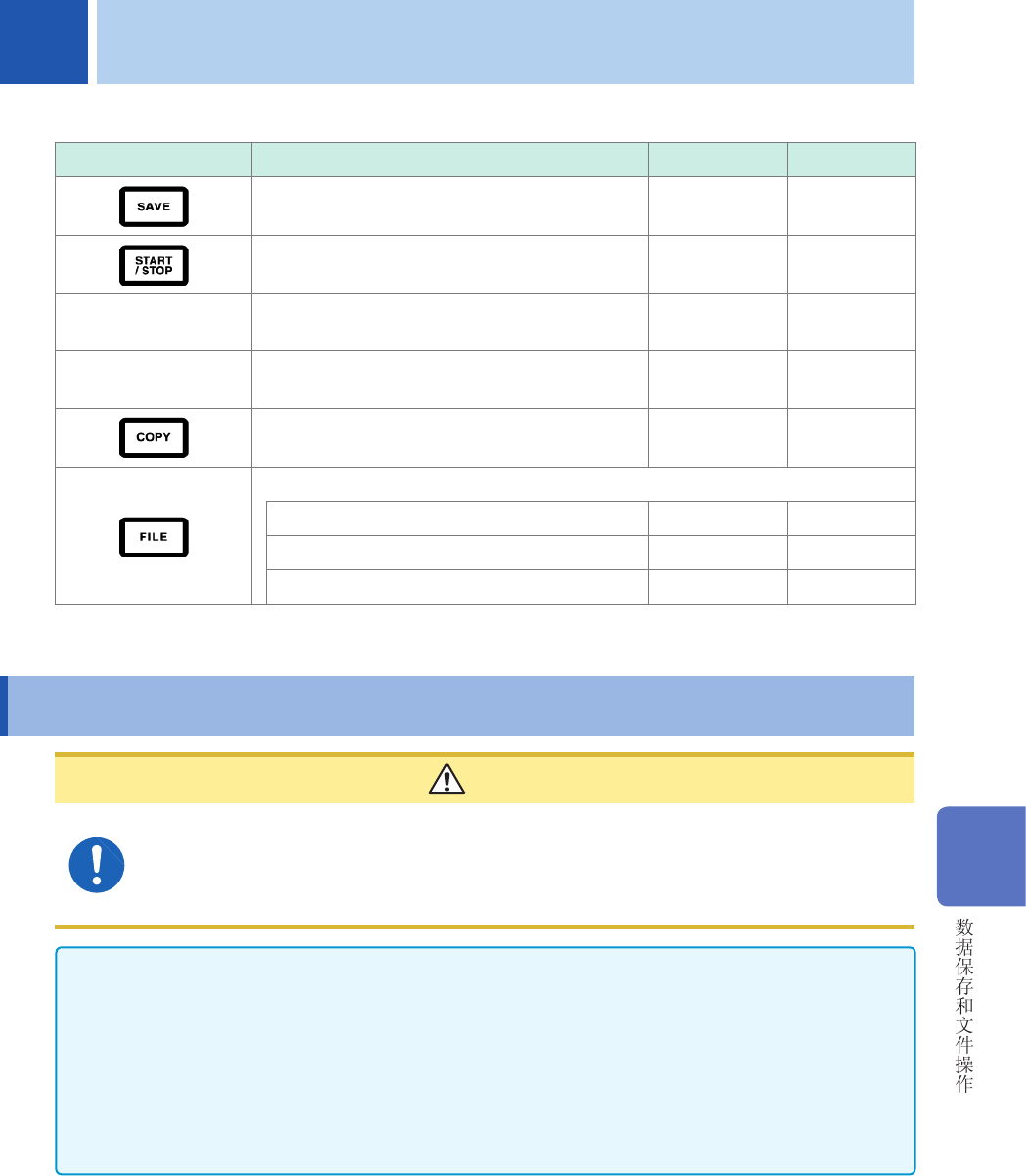 135 7 数据保存和文件操作 : 可保存,- : 不可保存 键 项目 内存 U 盘 [SA VE] 键 测量数据的手动保存 - [ST ART/ST OP] 键 测量数据的自动保存 Save W aveforms (在触摸面板上显示) 波形数据的保存 - Save FFT Spectrum (在触摸面板上显示) FFT 数据的保存 - [COPY] 键 画面硬拷贝的保存 - [FILE] 键 设置数据与设置…