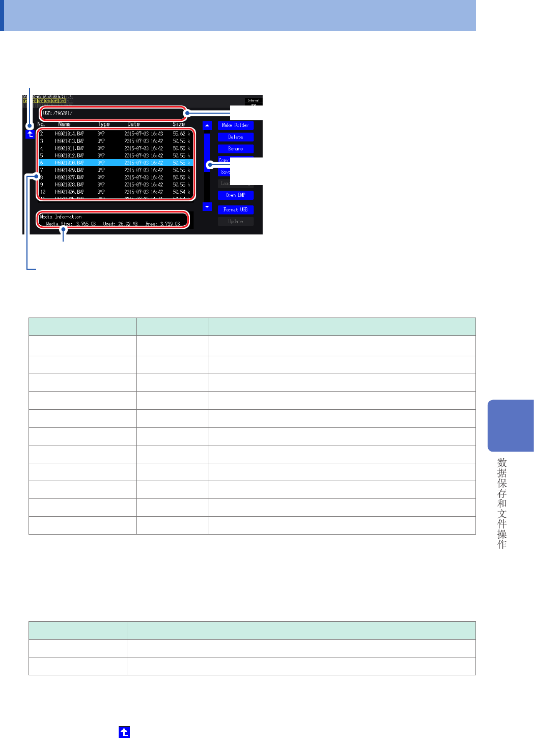 137 关于文件操作画面 7.2 关于文件操作画面 下面说明文件操作画面的显示。自动保存期间不能操作文件操作画面。 如果触摸,则会移动到上一级。 文件数较多 1 个画面显示不下时,或 变更显示位置时触摸。 显示保存的文件列表。 显示正在存取的 U 盘的信息。 表示画面中显示的文件夹。 数据的类型 数据的名称 ( Name ) 类型 ( T ype ) 内容 M6001nnn.CSV CSV 手动保存的测量数据 MMDDnnkk.CSV …