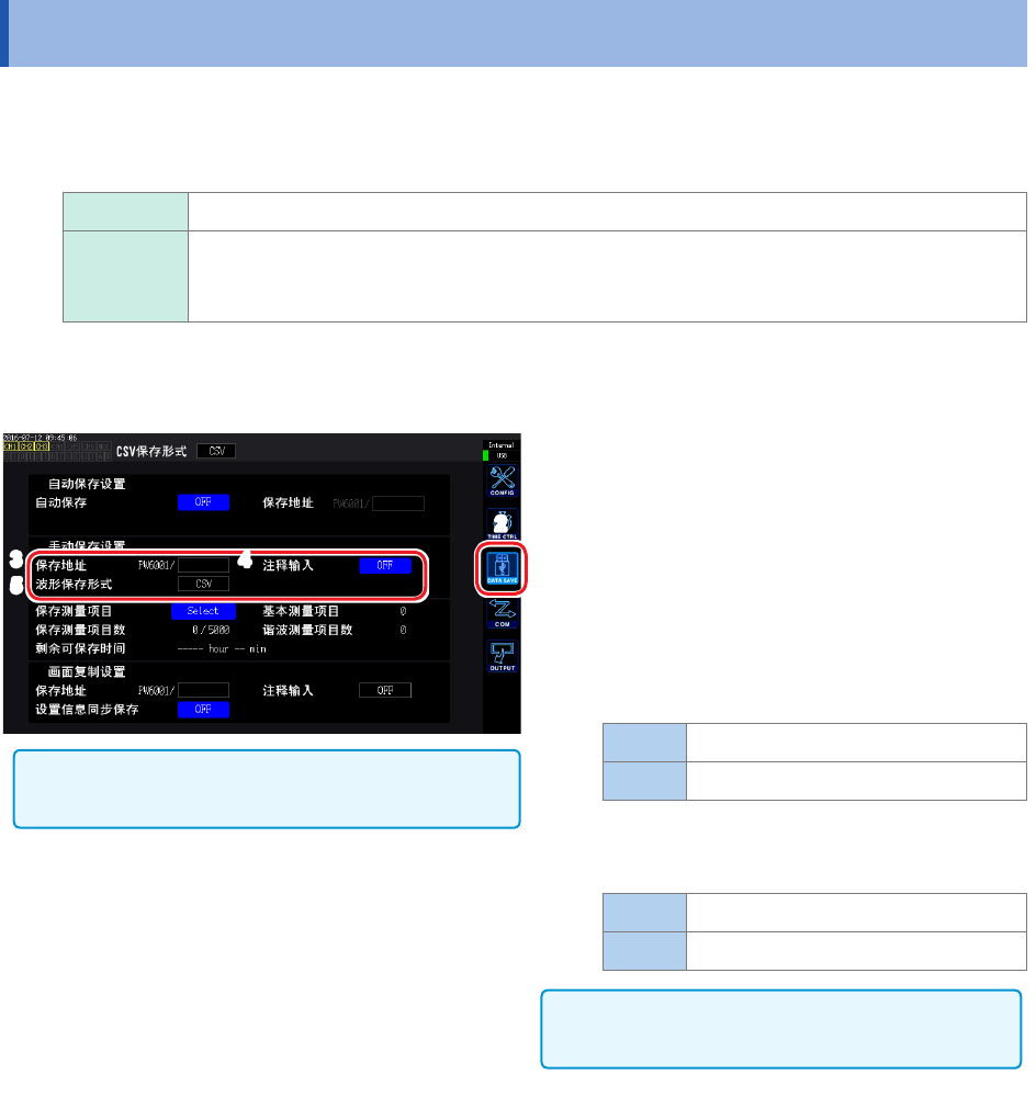 146 保存 FFT 数据 7.5 保存 FFT 数据 按照按下 Save FFT Spectrum 的时序保存 W A VE+FFT 画面中显示的 FFT 数据。保存处、注释输 入的设置与测量数据的手动保存通用。 保存处 仅可设置 U 盘 文件名 自动生成,扩展名仅为 CSV F6001nnn.CSV ( nnn 为同一文件夹内的连续编号 000 ~ 999 ) 例: F6001000.CSV (最初保存的文件) 保存的设置 2 3 …