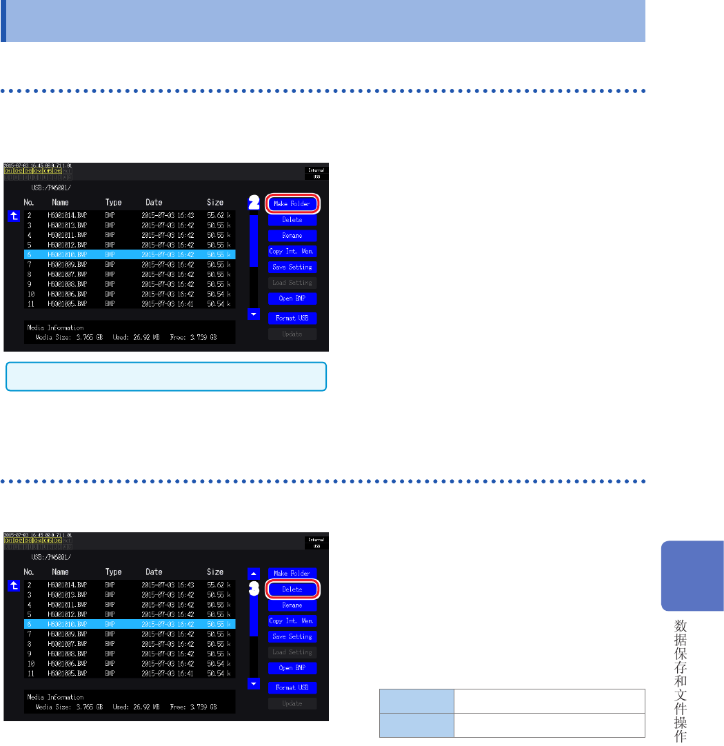 150 读取画面的硬拷贝 7.8 读取画面的硬拷贝 读取已保存的画面硬拷贝,并在画面中显示。 4 3 1 按下 [FILE] 键 2 触摸保存有画面硬拷贝的文件夹 3 触摸 BMP 文件 4 触摸 Open BMP 显示确认对话框。 5 选择执行 / 取消 是 执行 否 取消 7.9 读取设置数据 读取已保存的设置文件,恢复设置。 4 3 恢复原来设置时,选件等的组合必须相同。 如果不同,则不能执行。 1 按下 [FILE] 键 2 触…
