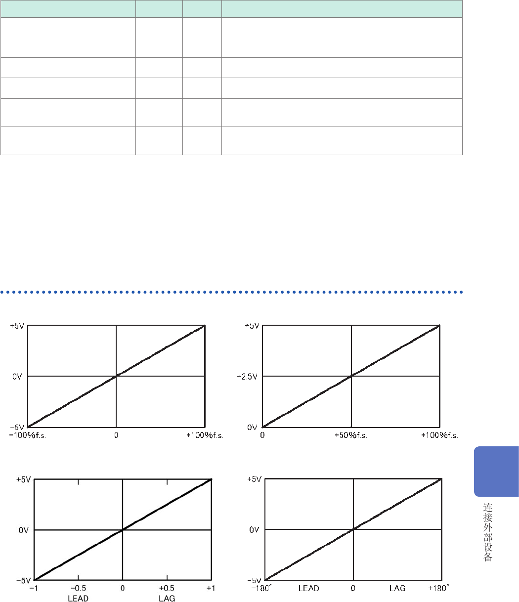 172 使用 D/A 输出 (仅限于带马达 &D/A 型号) (模拟输出与波形输出) : 输出电压带有极性 输出选择项目 标记 极性 额定输出电压 基波视在功率 Sfnd 与视在功率 (S) 相同 无功功率 Q 与有功功率 (P) 相同 基波无功功率 Qfnd 与有功功率 (P) 相同 功率因数 λ 相对于功率因数 ± 1 为 DC ± 5 V 基波功率因数 λ fnd 相对于基波功率因数 ± 1 为 DC …