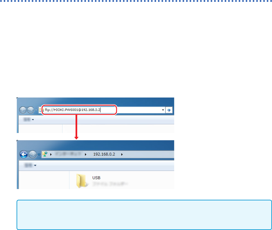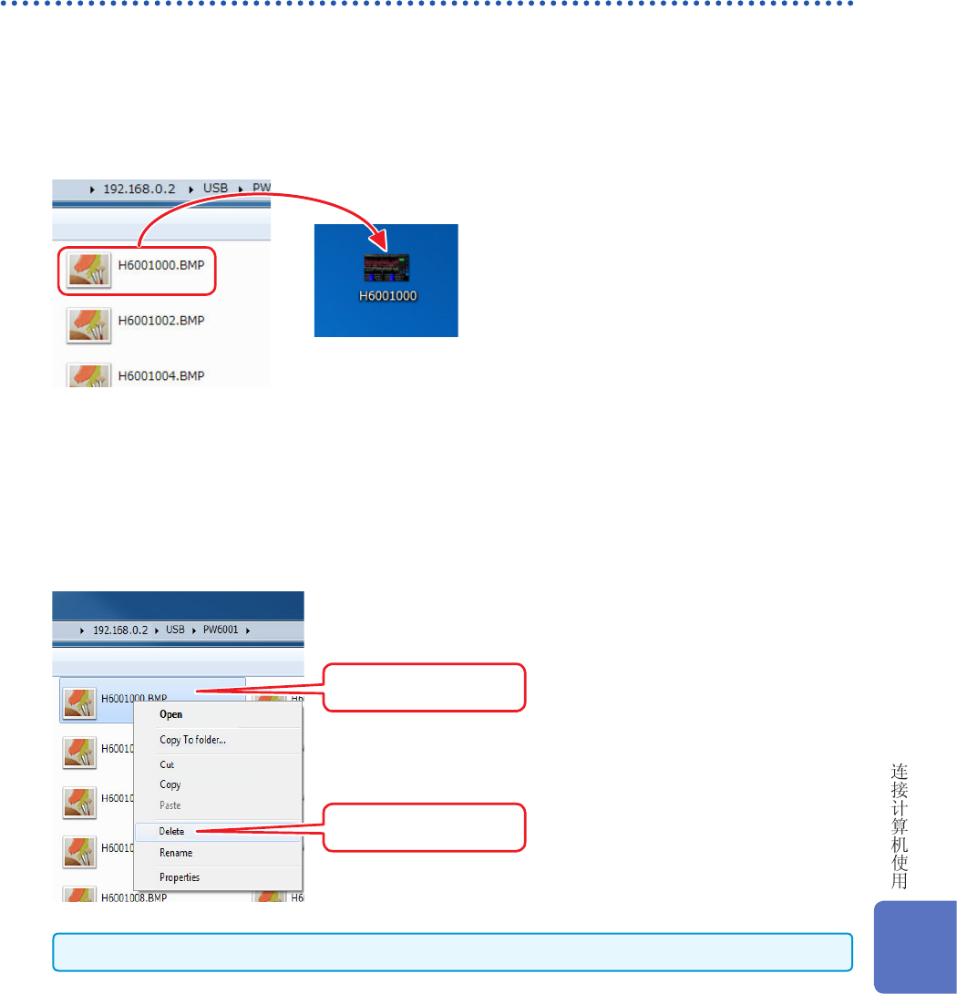 191 在计算机上操作本仪器的文件 (利用 FTP ) 通过 FTP 操作文件 下载文件 从文件夹一览中选择要下载的文件,然后用鼠标拖放 * 到下载目标 ( IE 之外的桌面或文件夹) 位置。 * : 在单击文件的状态下移动到目标位置后松开鼠标的动作 计算机的画面上 拖放 有时可能不会反映文件时间戳 (日期) 中的秒或时分秒。 删除文件 在 FTP 的文件夹一览中用鼠标右键单击文件,从下拉菜单中选择 [ 删除 ] 。 1 单击鼠标右键 …