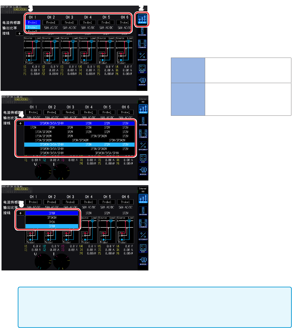 42 设置接线模式与电流传感器 2 3 4 5 1 按下 [INPUT] 键 2 触摸 WIRING 3 触摸并选择各通道使用的电流传感器 Probe 1 在 Probe1 端子上连接电流传感器时 选择。 自动设置输出比率。 Probe 2 在 Probe2 端子上连接电流传感器时 选择。 触摸 输出比率 ,选择已连接电流传感 器的输出比率或型号名称。 4 触摸 + ,设置接线模式 5 包括 2 通道以上的组合时 ,再次触摸并选 择接线…