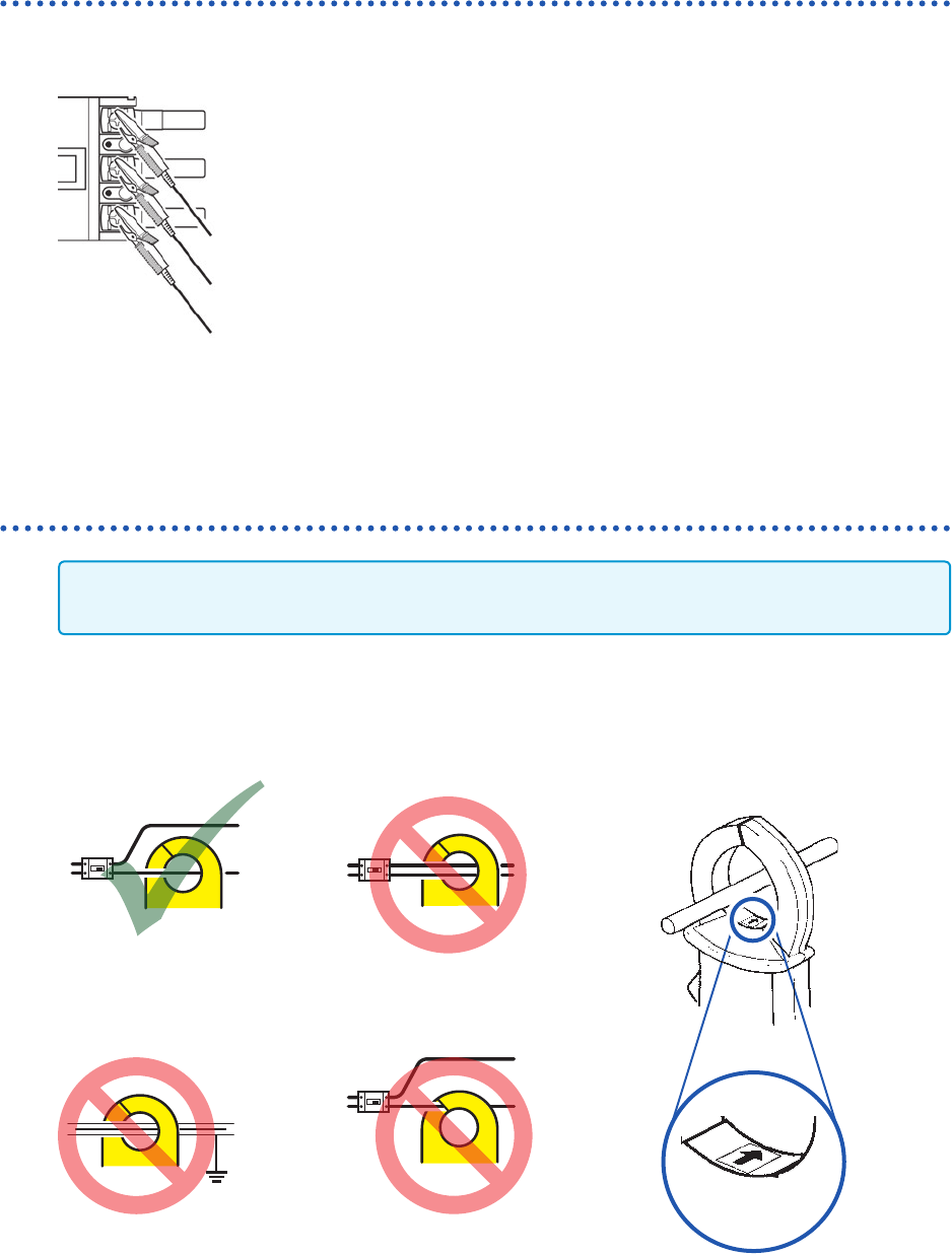 44 连接到测量线路上 (调零) 将电压线连接到测量线路上 例 : 断路器的次级侧 请可靠地夹在电源侧螺钉或配线条等金属部分上。 L9438-50 电压线 将电流传感器连接到测量线路上 重要事项 夹紧时,请将电流方向标记朝向负载侧。 请务必只夹住 1 个导体。 同时夹住单相 ( 2 个) 、三相 ( 3 个) 时,不能进行测量。 OK NO NO NO OK NO NO NO 电流方向标记 负载侧 导体 电源侧
