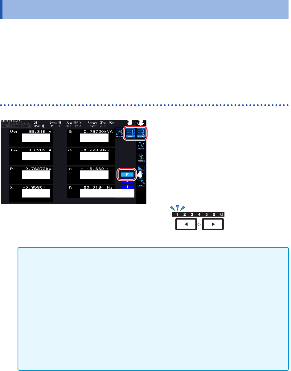 50 查看功率测量值,变更测量条件 3.2 查看功率测量值,变更测量条件 要查看各测量线路的功率测量值时,使用基础画面 。可一览显示各设置接线的功率测量值,或显示 电压、电流的详细测量值。 利用通道操作键变更要显示的通道,或变更电压、电流的量程。 触摸测量值图标,选择基础画面。 从画面的图标中选择 P (功率画面) 、 U (电压画面) 、 I (电流画面) 、 Integ. (累计画面) 。 显示功率测量值 4 电压有效值 电流有效值…