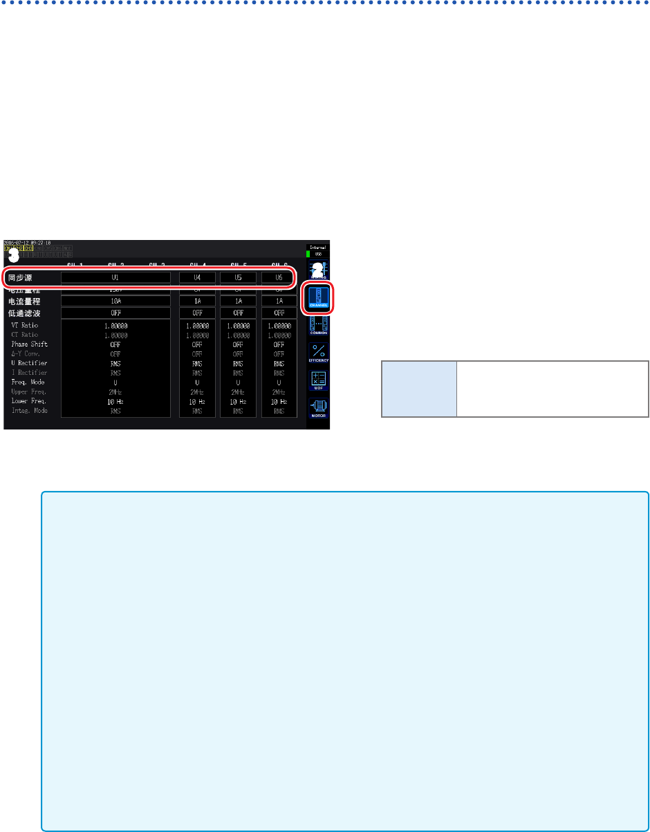 在测量交流的通道中,将与测量通道频率相同的频率输入选为同步源。在同步源中选择的目标频
