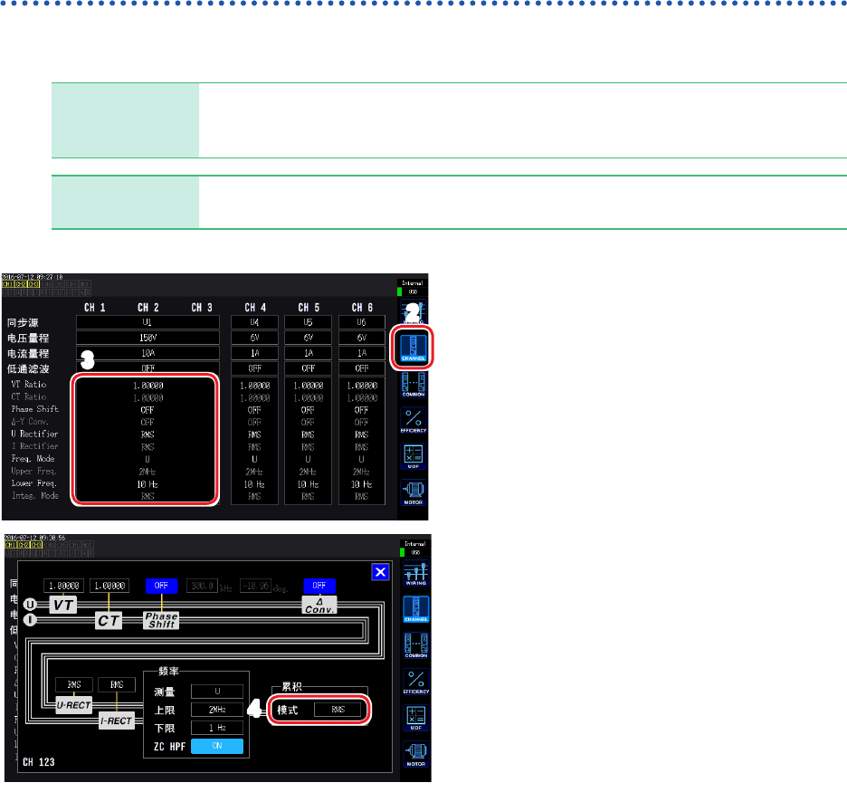 64 查看累计值 设置累计模式 设置各通道的累计模式。累计模式包括下述 2 种模式,可根据接线进行选择。 DC 模式 • 按极性累计各采样的瞬时电流值、瞬时功率值。 • 仅 1P2W 接线时可选择。 • 同时进行电流累计 (Ih+ 、 Ih- 、 Ih) 与有功功率累计 (WP+ 、 WP- 、 WP) 6 个项目的累计。 RMS 模式 • 累计各数据更新速率的电流有效值、有功功率值。 • 仅对有功功率按极性进行累计。 2 3 4 1 …
