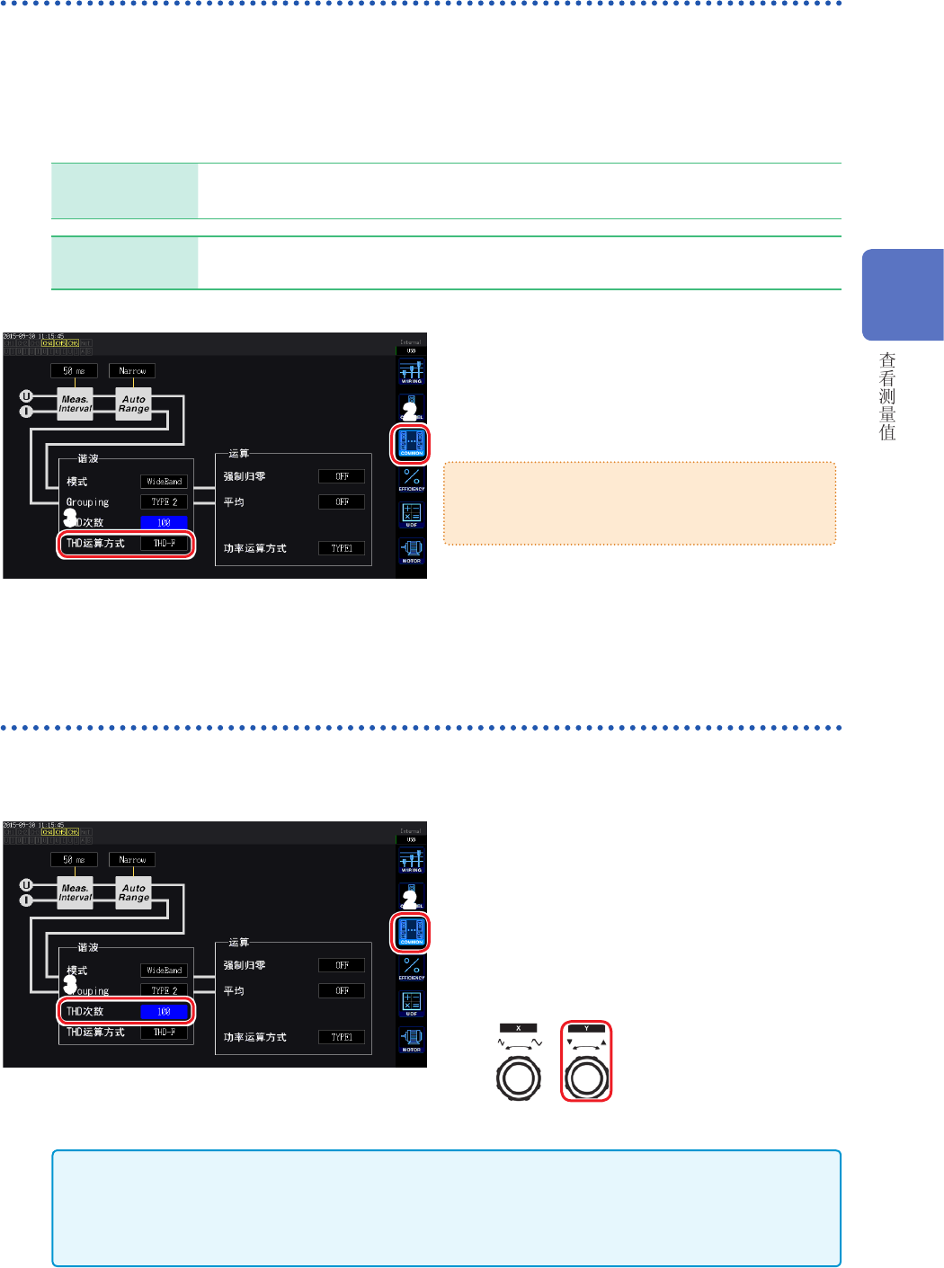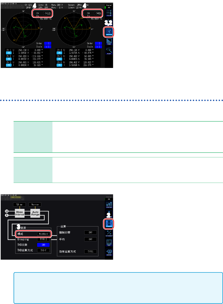 71 查看谐波测量值 设置 THD 运算方式 设置总谐波失真率 THD 的运算方式。 设置使用 THD-F 或 THD-R 的选择以及最多运算次数。 该设置对所有通道的所有电压与电流的谐波测量有效。 THD 运算公式 THD-F (初始设置) 基波的总谐波比例 是 IEC 标准等当中常用的设置。 THD-R 含基波总谐波的总谐波比例 波形严重失真时,为低于 THD-F 的值。 2 3 1 按下 [INPUT] 键 2 触摸 COMMON…