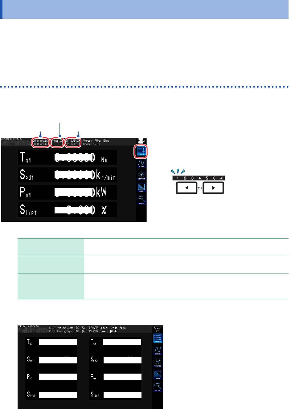 78 查看马达测量值 (带马达 &D/A 型号) 3.6 查看马达测量值 (带马达 &D/A 型号) 本仪器的带马达 &D/A 型号可通过与外部扭矩传感器及转速表组合对马达进行分析。 另外,用于马达分析的马达输入部分可用作独立的 2 通道模拟 DC 输入或 4 通道脉冲输入,也可以用 作波形测量的触发。 参照 : “ 触发的设置 ” (第 98 页) 显示马达测量值 在基本显示 ( B ASIC ) 画面中显示 …
