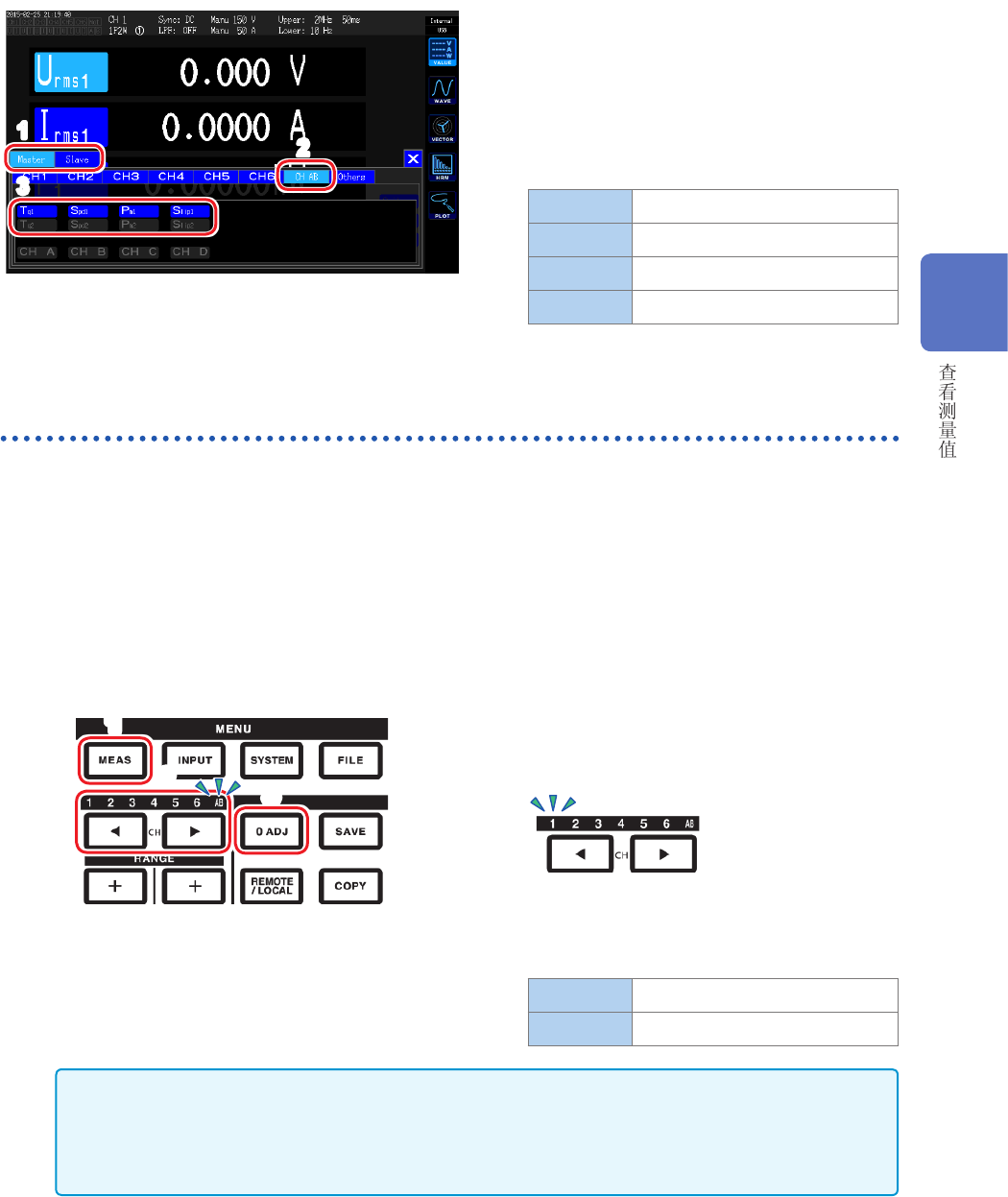 MEAS画面的任意画面,如果通道显示LED 的 AB 点亮,只要按下[0ADJ] 键,则可执