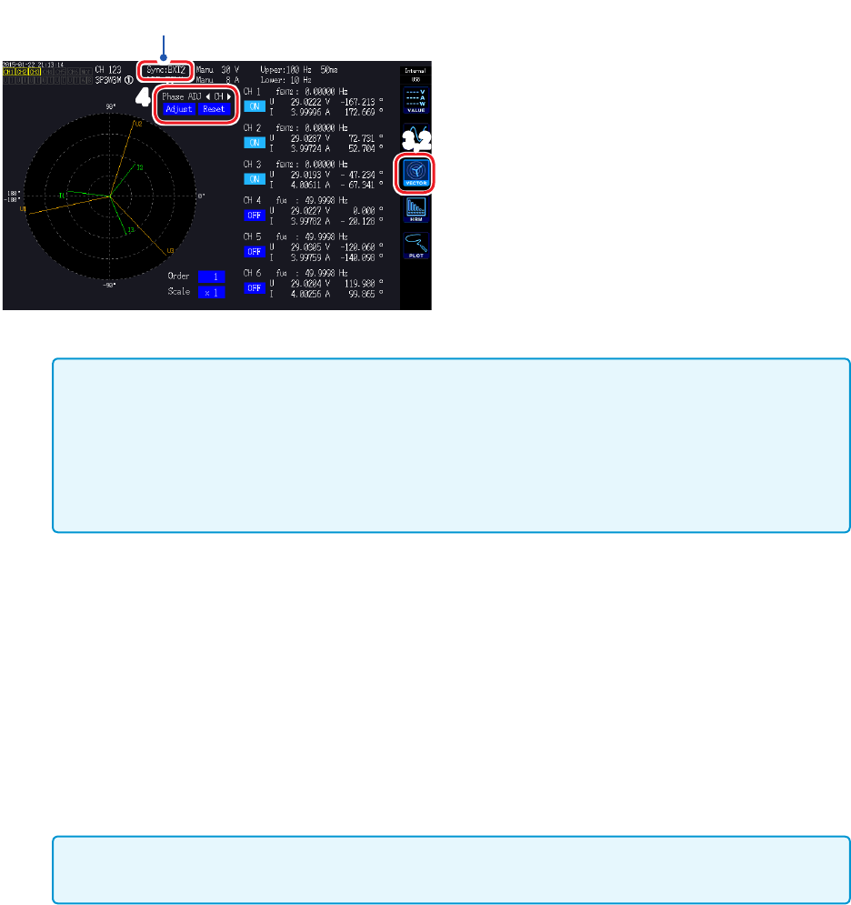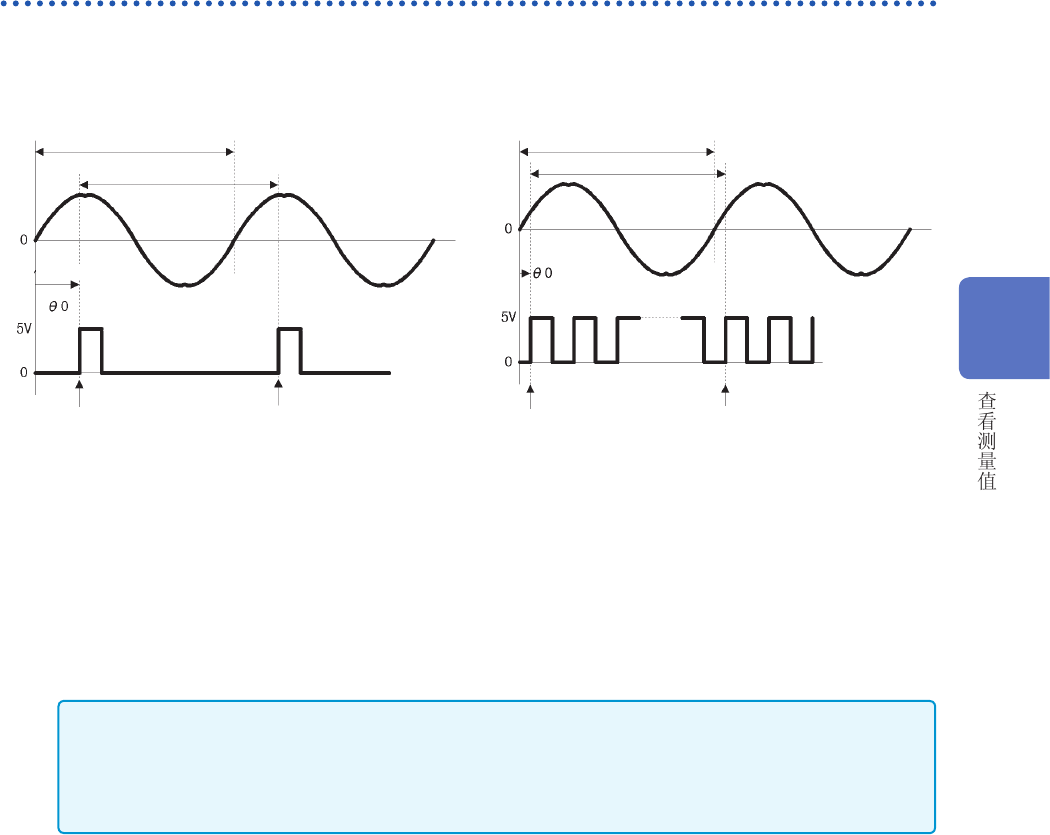 87 查看马达测量值 (带马达 &D/A 型号) 测量马达的电相角 如果在旋转信号输入中输入脉冲时将输入通道 1 ~ 6 的 同步源 设为 Ext1 或 Ext2 ,则可查看以脉冲 为基准的电压、电流相位的变化。 利用多个脉冲测量电相角时 • 建议使用原点信号 ( Z 相) 。如果使用原点信号 ( Z 相) ,则可根据原点信号确定基准脉冲,始终进行 以固定脉冲为基准的相位测量。 • 不使用原点信号 ( Z 相) 时,同步时确定基…