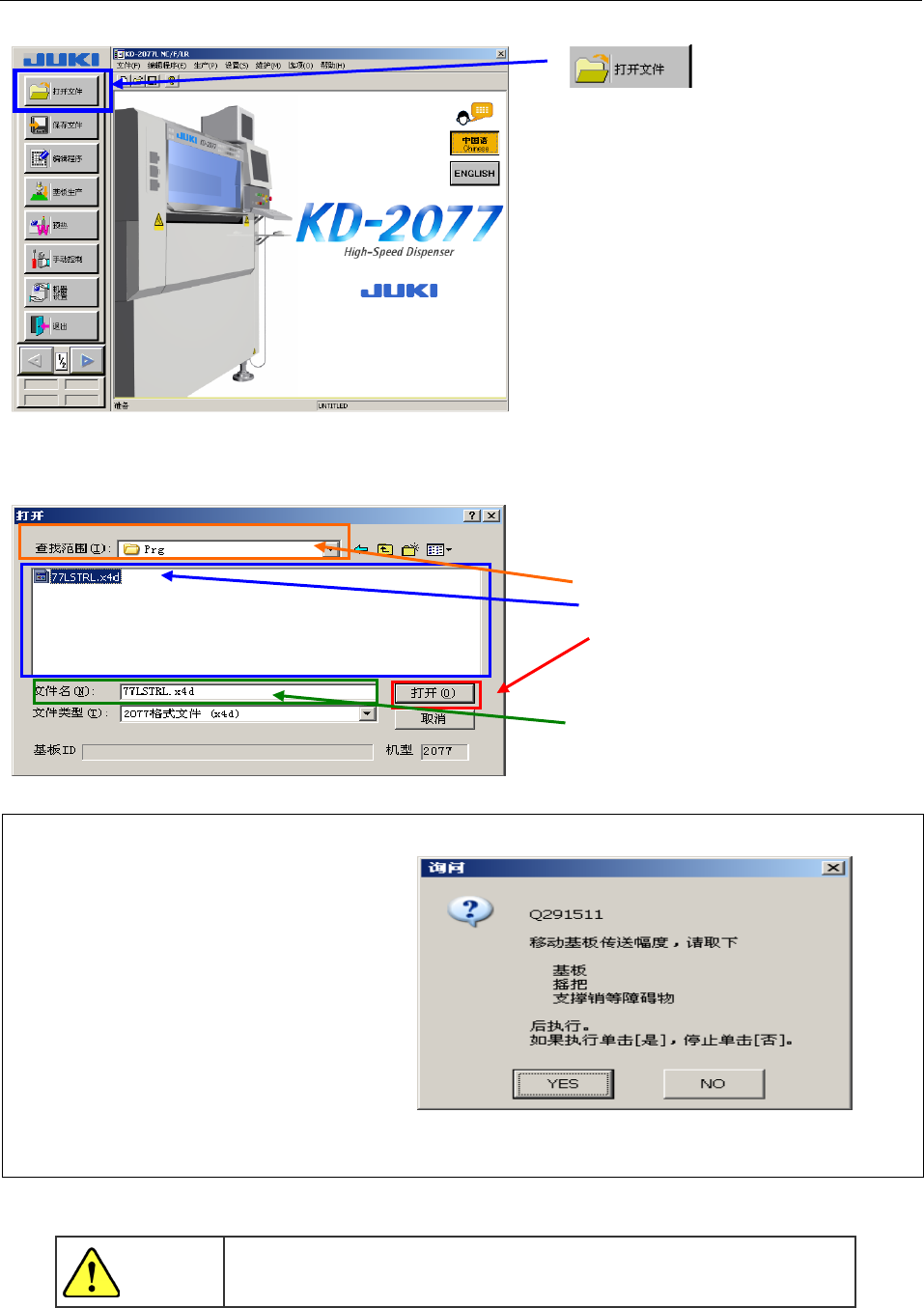 2-4 2-4 读入生产程序。 ① 选择「打开文 件 」按钮。 ② 显示打开文件 后的画面。 请选择生 产程序,再选择「 打开」 。 如果带有自动 基板 宽 调整装置(选项) ,则将显示以下 信息。 在该画面上 选择「 Y ES 」 ,则显示自动基板 宽 调整画面。 ※ 有关自 动基板宽调整的详细 内容,请 参考《使用说明 书 CD 》的 “ 4-5-4-1-2 自动 基板宽调整” 。 <程序> 1. 选择文件 夹。 2. 选择文件(生…