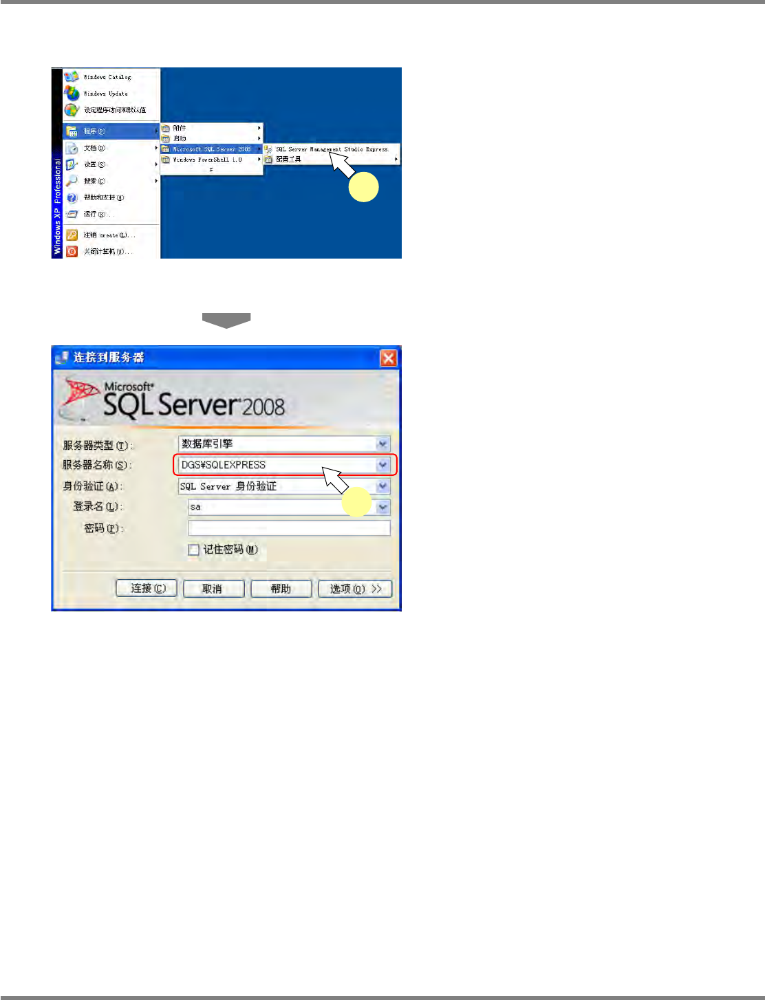 NPM-DGS 程序手册 安装以及设定 EJS9AC-MB-02P-21 Page 2-73 服务器名的确认 1 启动 [ 开始 ] [ 程序 ] [Microsoft SQL Server XXXX] [SQL Server Management Studio Express] 。 “XXXX” 根据所安装 SQL Server 的版本而有 所不同。 2 确认 < 连接到服务器 > 画面的 ‘ 服务器名…