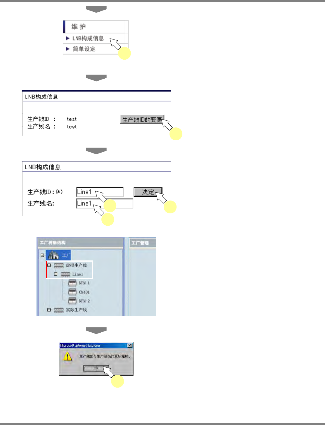 NPM-DGS 程序手册 安装以及设定 EJS9AC-MB-02P-21 Page 2-97 4 在左側的菜单中选择 [ 维护 ] 下面的 [LNB 构成信息 ] 5 点击 [ 生产线 ID 的变更 ] 。 6 输入 ‘ 生产线 ID’ ,点击 [ 决定 ] 。 不输入生产线名也可。 关于生产线 ID LNB 的生产线 ID 是指以 DGS 的工厂管理的生 产线构成表示的 ‘ 生产线名称 ’ 。 工厂管理的生产 线名和 LNB …