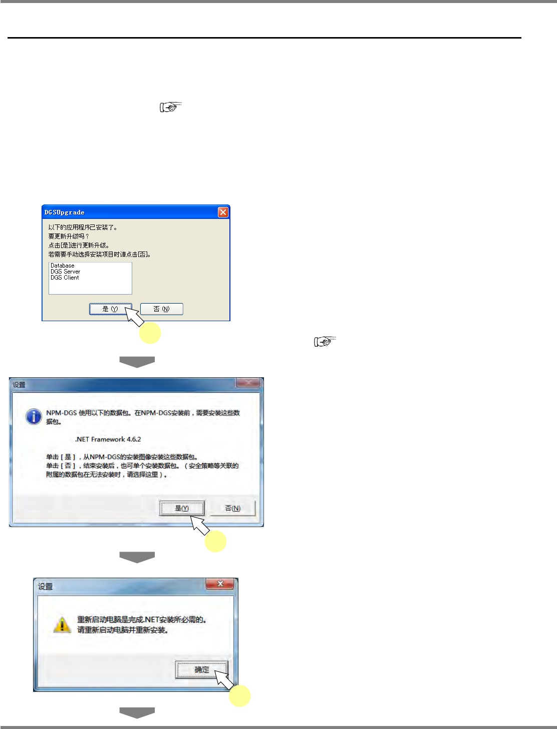 NPM-DGS 程序手册 2.2 DGS 应用程序的升级 Page 2-100 EJS9AC-MB-02P-21 2.2 DGS 应用程序的升级 2.2.1 DGS 备份的编制 在升级之前,建议先实施 DGS 数据库的备份。 具体步骤,请参照 ‘3.2.2 备份 / 恢复 ’ 。 2.2.2 DGS 安装构成整体升级 在不变更 DGS 的安装构成的情形下,对应用程序 实施升级之际执行本项功能 。 1 在插入 CD-ROM 后自动显示的画…