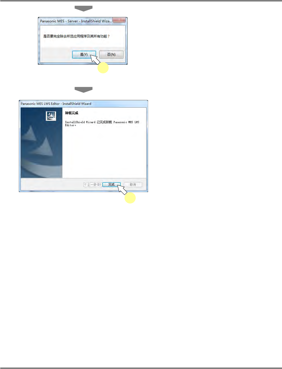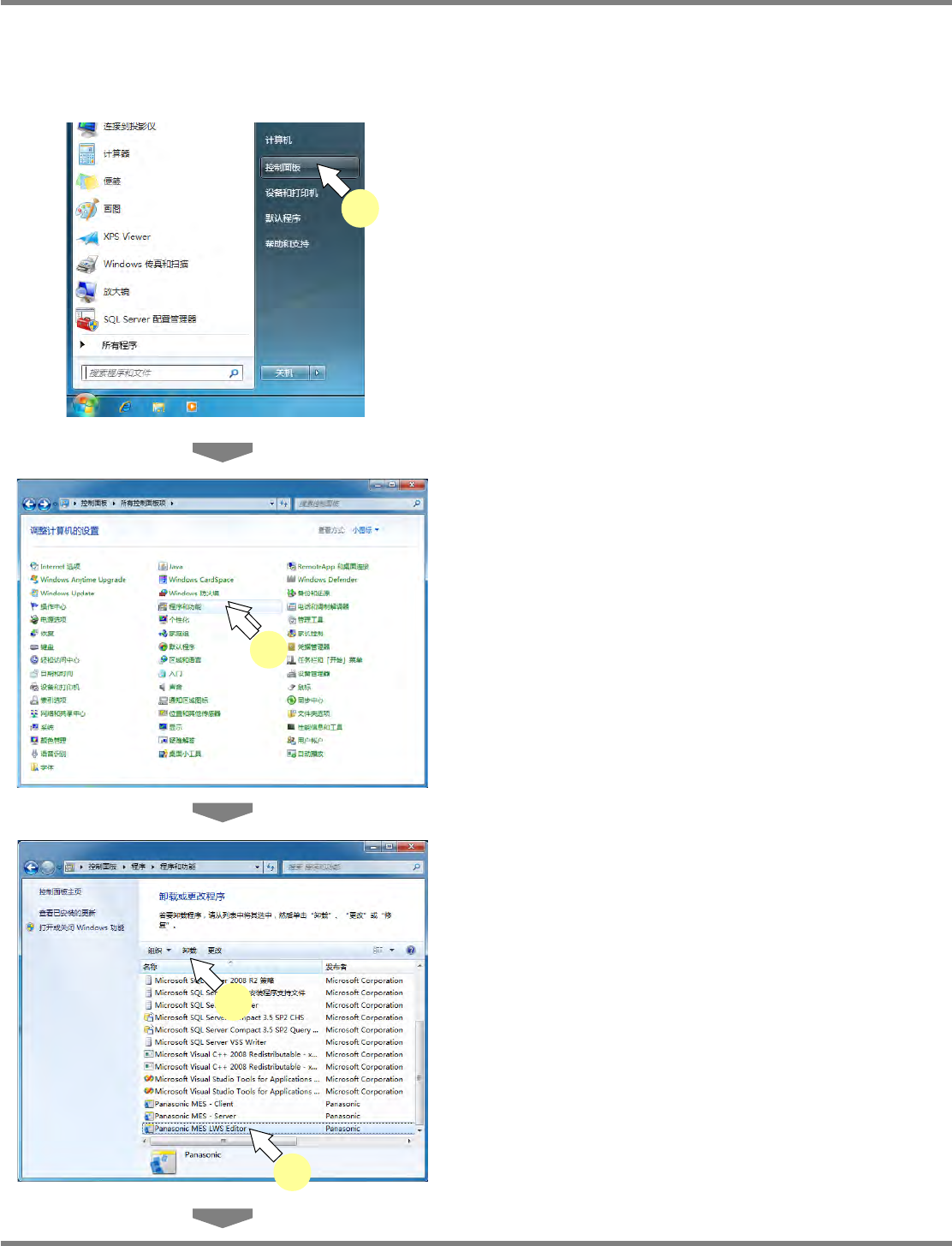 NPM-DGS 程序手册 2.3 DGS 的卸载 Page 2-142 EJS9AC-MB-02P-21 2.3.4 LWS 数据编辑器的卸载 在此说明 LWS 数据编辑器的卸载方法。 1 打开 [ 开始 ] [ 控制面板 ] 。 显示出 < 控制面板 > 画面。 2 双击 ‘ 程序和功能 ’ 。 显示出 < 卸载或更改程序 > 画面。 3 在一览表中选择 ‘Panasonic MES LWS Edi…
