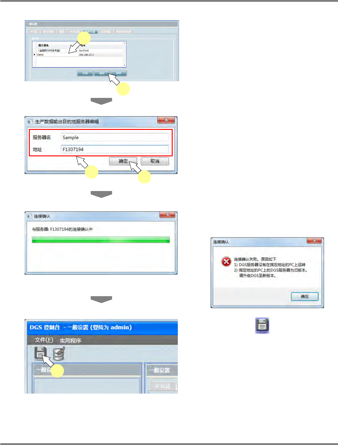 NPM-DGS 程序手册 3.2 关于环境设定画面 EJS9AC-MB-03P-18 Page 3-33 服务器的编辑 1 从服务器一览中选择想要编辑的服务 器。 2 点击 [ 编辑 ] 。 将显示 < 生产数据输出目的地服务器编缉 > 画 面。 3 输入 ' 服务器名 ' 和 ' 地址 ' 。 除了可使用数字 IP 地址以外, 地址还可设为连 接目的地的 PC 名称。 不…