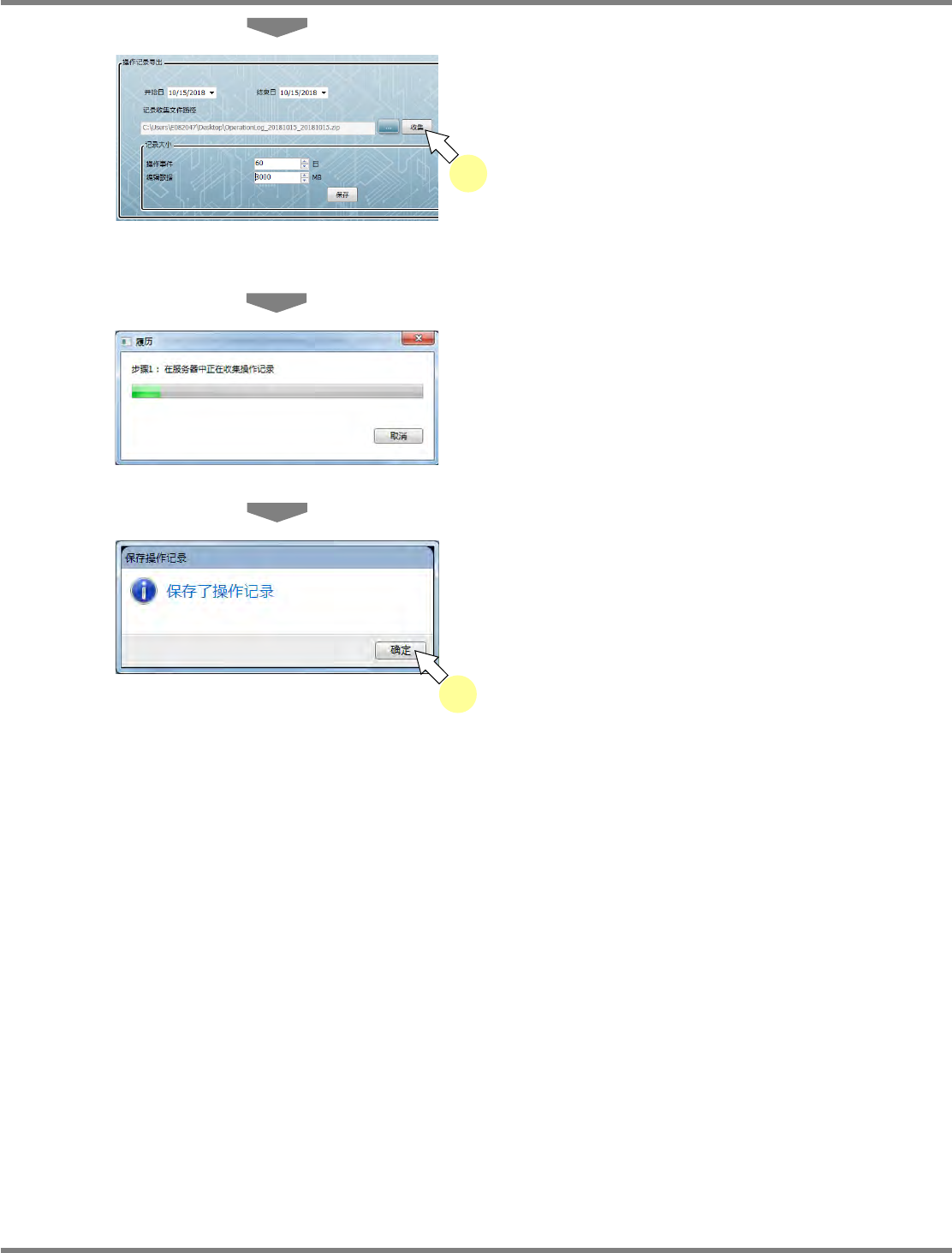 NPM-DGS 程序手册 3.2 关于环境设定画面 Page 3-40 EJS9AC-MB-03P-18 操作记录预览的显示 想要确认无需详细内容的操作记录时 , 在操作记 录预览上指定时间,便可通过 DGS 画面对简易 操作记录进行确认。 1 在文本框内输入开始日、 结束日, 或者 点击下拉菜单设定显示记录的期间。 点击 ,能够通过日历设定日期。 不能设定本日之后的日期。 2 点击 [ 视图 ] 。 将显示收集操作记录…