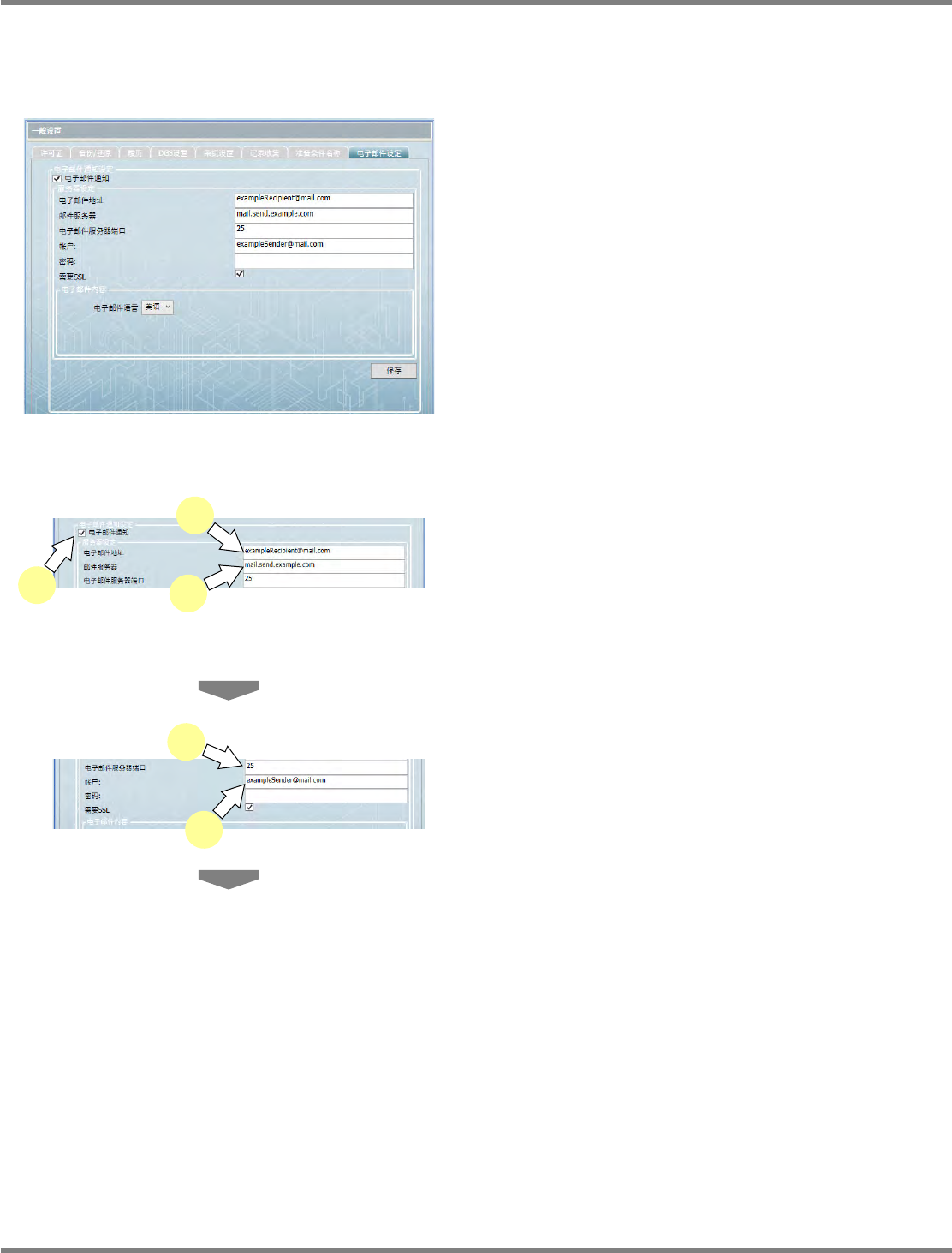 NPM-DGS 程序手册 3.2 关于环境设定画面 Page 3-56 EJS9AC-MB-03P-18 3.2.9 电子邮件设置 在执行了电子邮件设置后,如果在 [ 环境设定 ] 的操作纪录画面上登录了更改理由 ,便可自动向设 定的电子邮件地址发送电子邮件。 1 勾选 ‘ 电子邮件通知 ’ 。 2 设定发送电子邮件的地址。 3 设定发送电子邮件服务器的主控名称。 4 设定发送电子邮件的服务器端口。 5 设定发送源的电子邮件地址。 En…