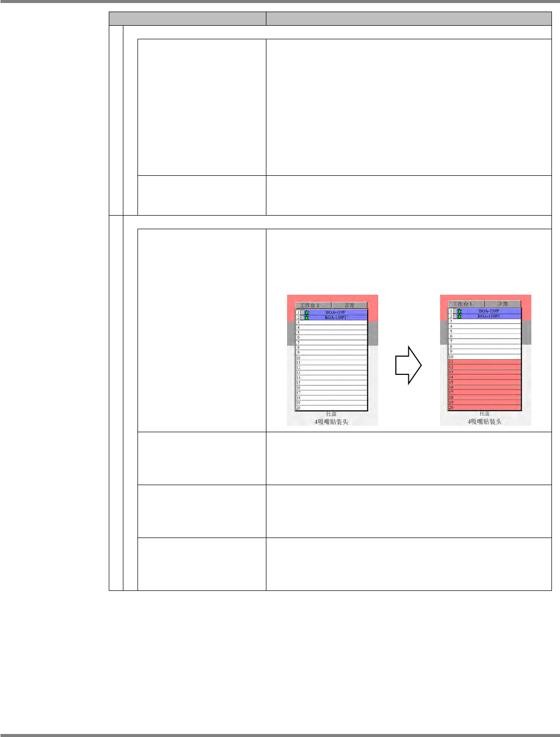 NPM-DGS 程序手册 4.3 假想生产线的构筑 Page 4-48 EJS9AC-MB-04P-37 项目 说明 软开关 ‘ 吸着 ’ ‘ 贴装角度识别元件 同时吸 着 ’ 对进行贴装角度识别的元件设定是否 执行同时吸着。 • [ON] 如果考虑到贴装角度的吸着角度与其 他元件相同,则执行同时 吸着。 • [OFF] 设定了贴装角度识别的元件将为个别 吸着。 在 2 / 3 / 4 吸嘴贴装头下,与设定无关而可同时吸 着。 ‘ …