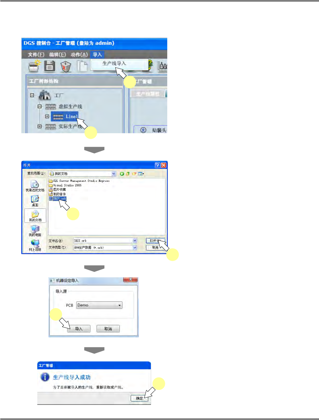 NPM-DGS 程序手册 4.3 假想生产线的构筑 EJS9AC-MB-04P-37 Page 4-65 4.3.4 导入生产线 通过执行导入生产线的操作,可以从 生产数据导入生产线信息。 1 选择生产线。 2 选择菜单的 [ 导入 ] [ 生产线导入 ] 。 将会显示 < 打开文件 > 画面。 3 选择导入的生产数据后,点击 [ 打开 ] 。 如果即已在生产线上登录了设备,即 会覆盖保 存。 可从下述文件中选择…