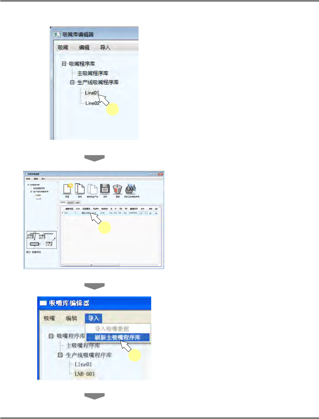 NPM-DGS 程序手册 4.4 吸嘴程序库编辑器 EJS9AC-MB-04P-37 Page 4-83 4.4.9 主吸嘴程序库的更新 1 选择吸嘴程序库内的生产线吸嘴程序 库。 2 选择需要向主吸嘴程序库更新信息的 吸嘴。 需要选择多个时, 按住 [Shift] 键或 [Ctr l] 键的同时 选择吸嘴。 3 选择菜单栏的 [ 导入 ] [ 刷新主吸嘴程 序库 ] 。 Factory040408S-0 1C00 1 Fact…