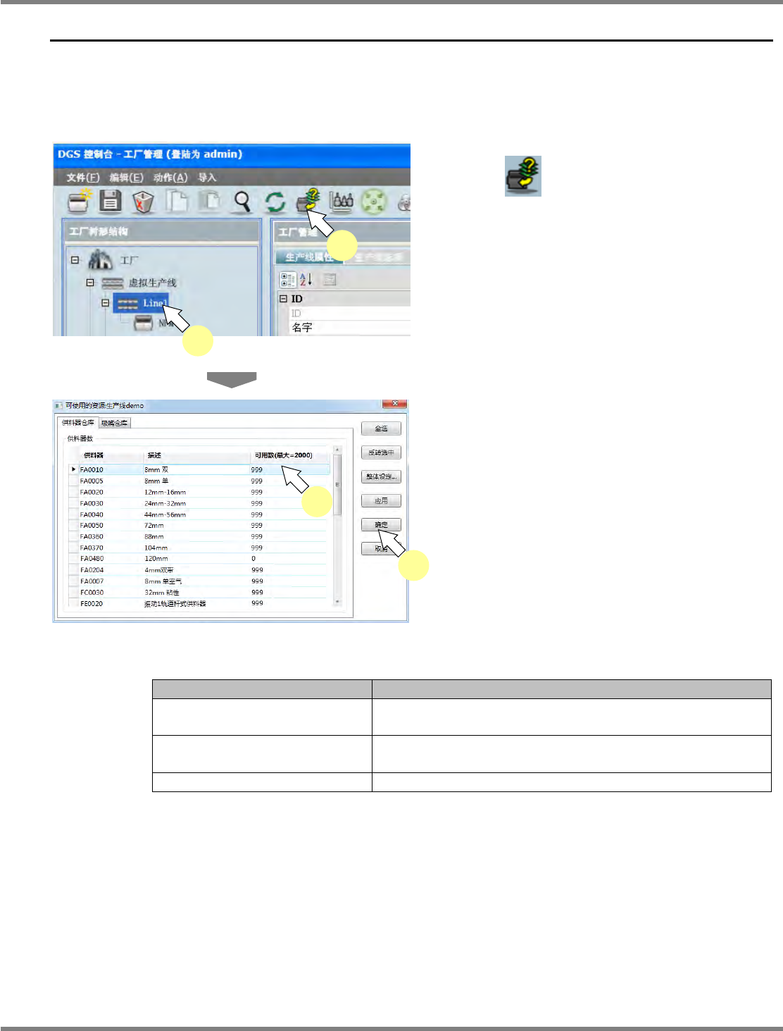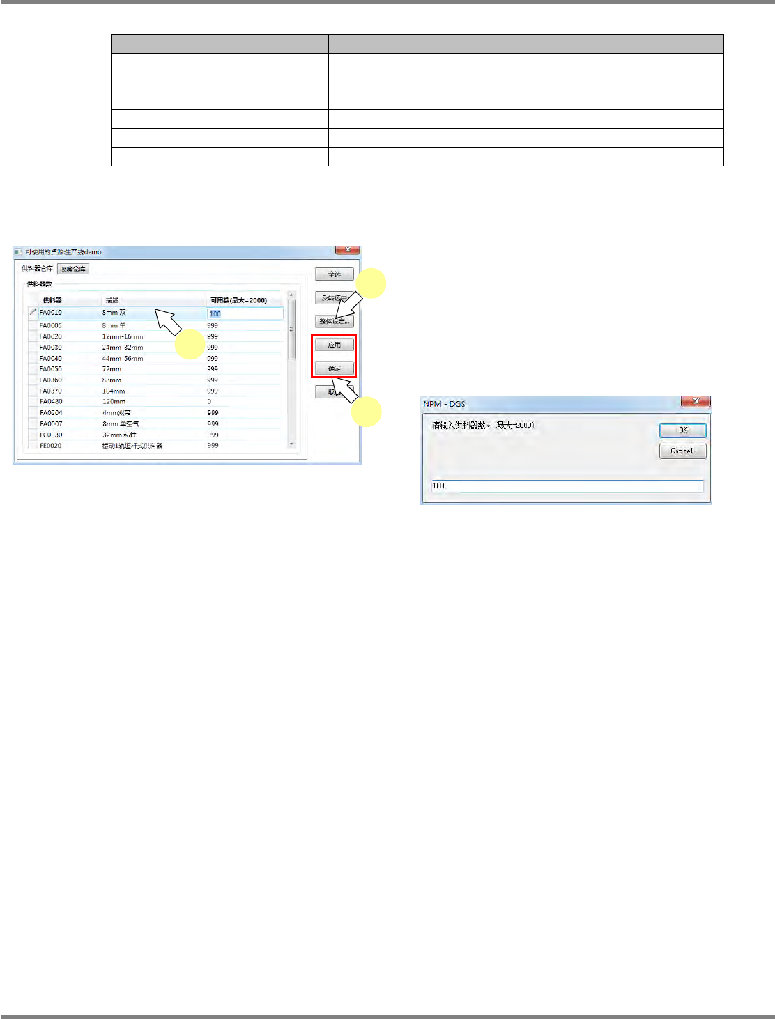 NPM-DGS 程序手册 4.11 供料器仓库的設定 EJS9AC-MB-04P-37 Page 4-121 4.11 供料器仓库的設定 在供料器仓库的設定中,设定供料器 。 供料器数的确认和编辑 1 选择需要设定的生产线后, 点击工具栏 的 ( 编辑仓库 ) 。 显示出供料器仓库设定画面。 在供料器数列表中显示以下字段。 • ‘ 供料器 ’ • ‘ 描述 ’ • ‘ 可用数 ’ 2 输入可利用的供料器数。 3 点击 [ 确…