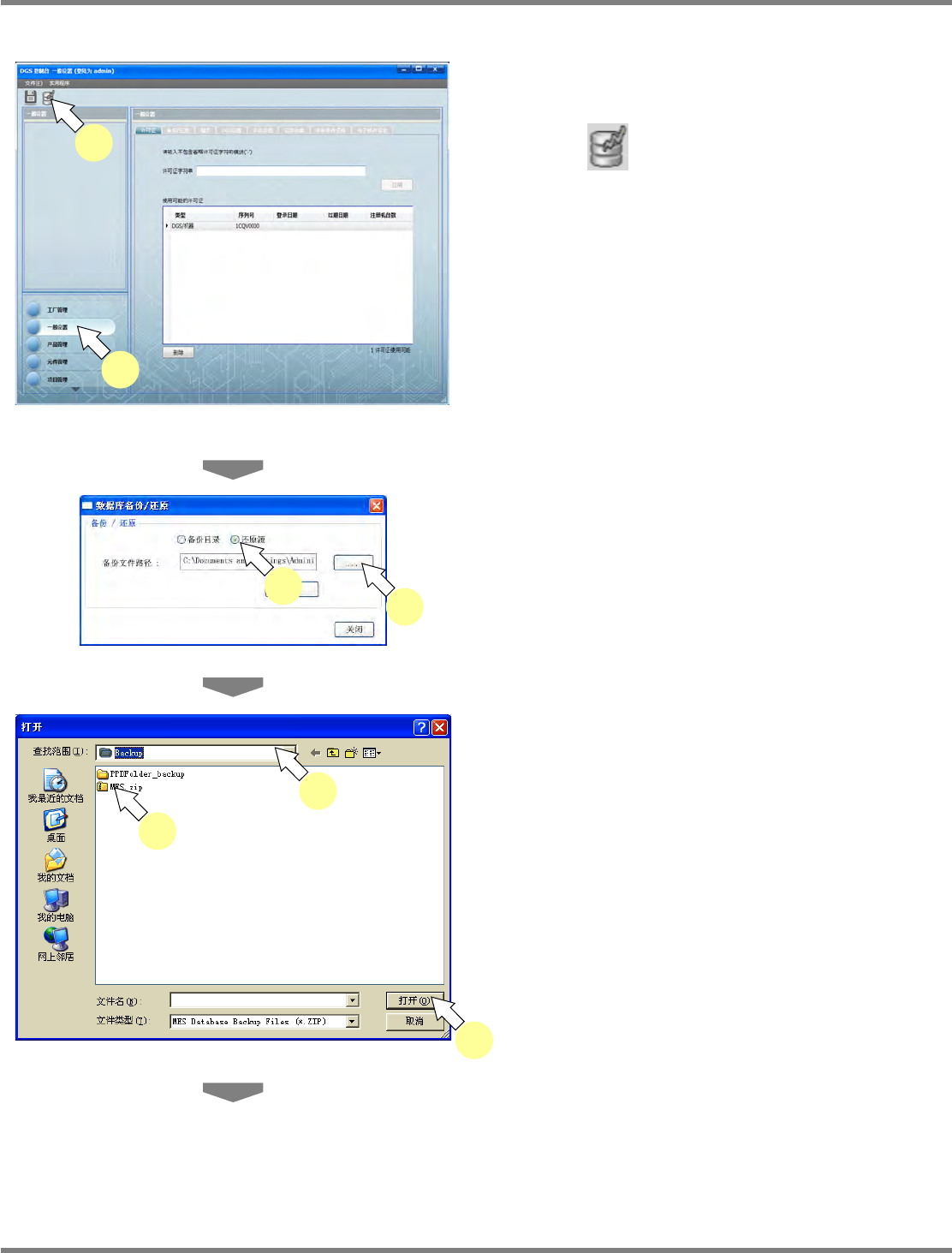 NPM-DGS 程序手册 3.2 关于环境设定画面 EJS9AC-MB-03P-18 Page 3-11 8 点击 [ 还原 ] 。 将显示确认画面。 9 选择是否继续进行用户设置。 将实施数据的还原。 没有继续时,将会显示下述信息,并 针对在备 份所恢复的实际生产线而追加访问权 。生产线 的访问权设定,请参照下述记载。 ( ‘8.1.5 用户帐户的变更 ■可参照实际 生产线的变更 ’) 10 将显示还原结束的对话框, 点击…