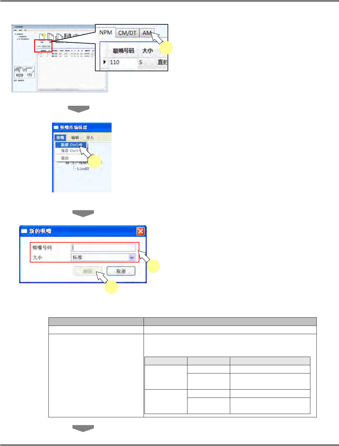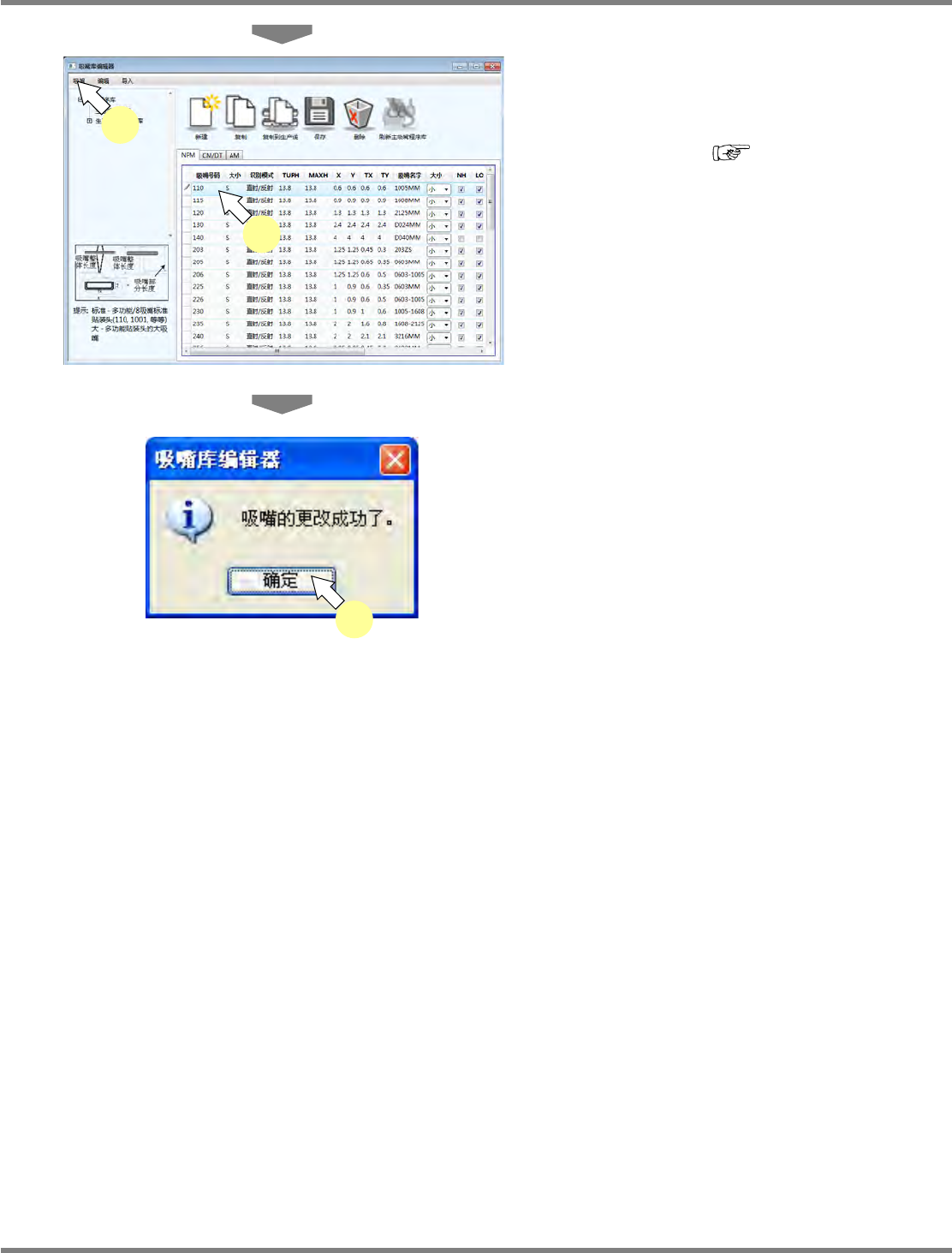NPM-DGS 程序手册 4.4 吸嘴程序库编辑器 EJS9AC-MB-04P-37 Page 4-73 5 输入吸嘴的详细内容。 需要设定的详细内容,由敝公司附随 吸嘴而提 供。请将记载内容输入进追加行的数 据内。 项目的详细内容 : ‘4.4.3 吸嘴数据 ’ 6 选择菜单栏的 [ 吸嘴 ] [ 保存 ] 。 7 点击 [ 确定 ] 。 Factory040404S-0 4C00 7 Factory040404S-0 3C0…