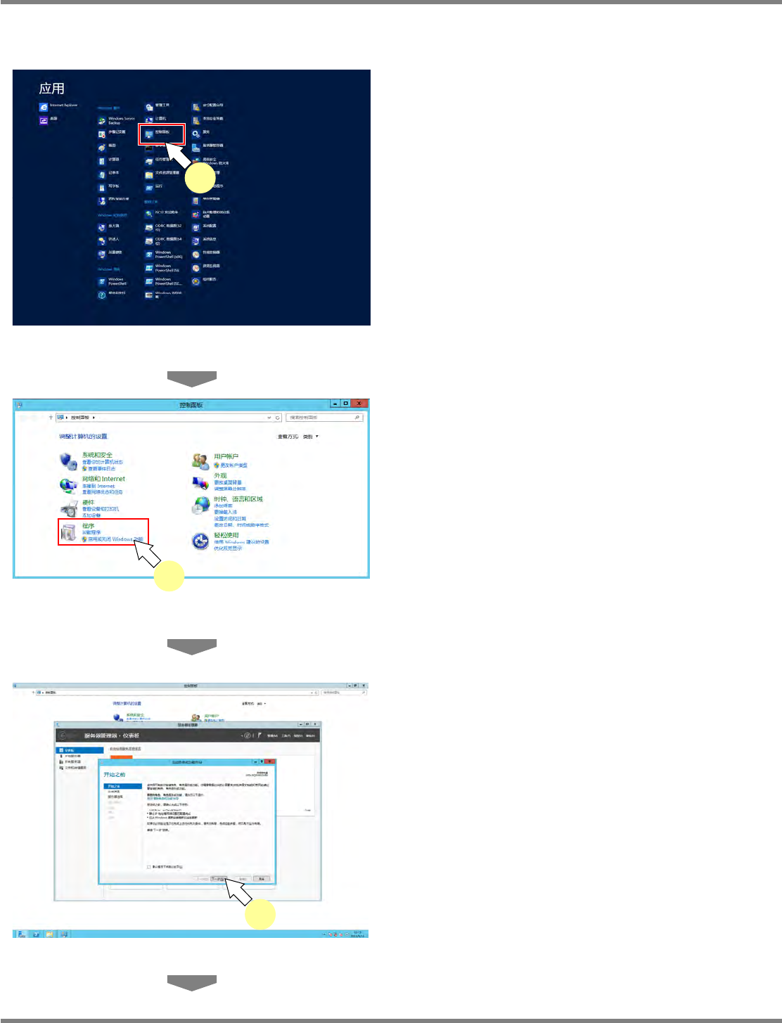 NPM-DGS 程序手册 2.1 NPM-DGS 的安装 Page 2-6 EJS9AC-MB-02P-21 OS 为 Windows Server 2012 时 1 在按住 [Windows] 键的同时, 按 [Q] 键打 开应用画面。 2 点击 [ 控制面板 ] 。 3 点击程序的 [ 启用或关闭 Windows 功 能 ] 。 将启动服务管理器,并打开添加角色 和功能向 导。 4 点击 [ 下一步 ] 。 Install0…
