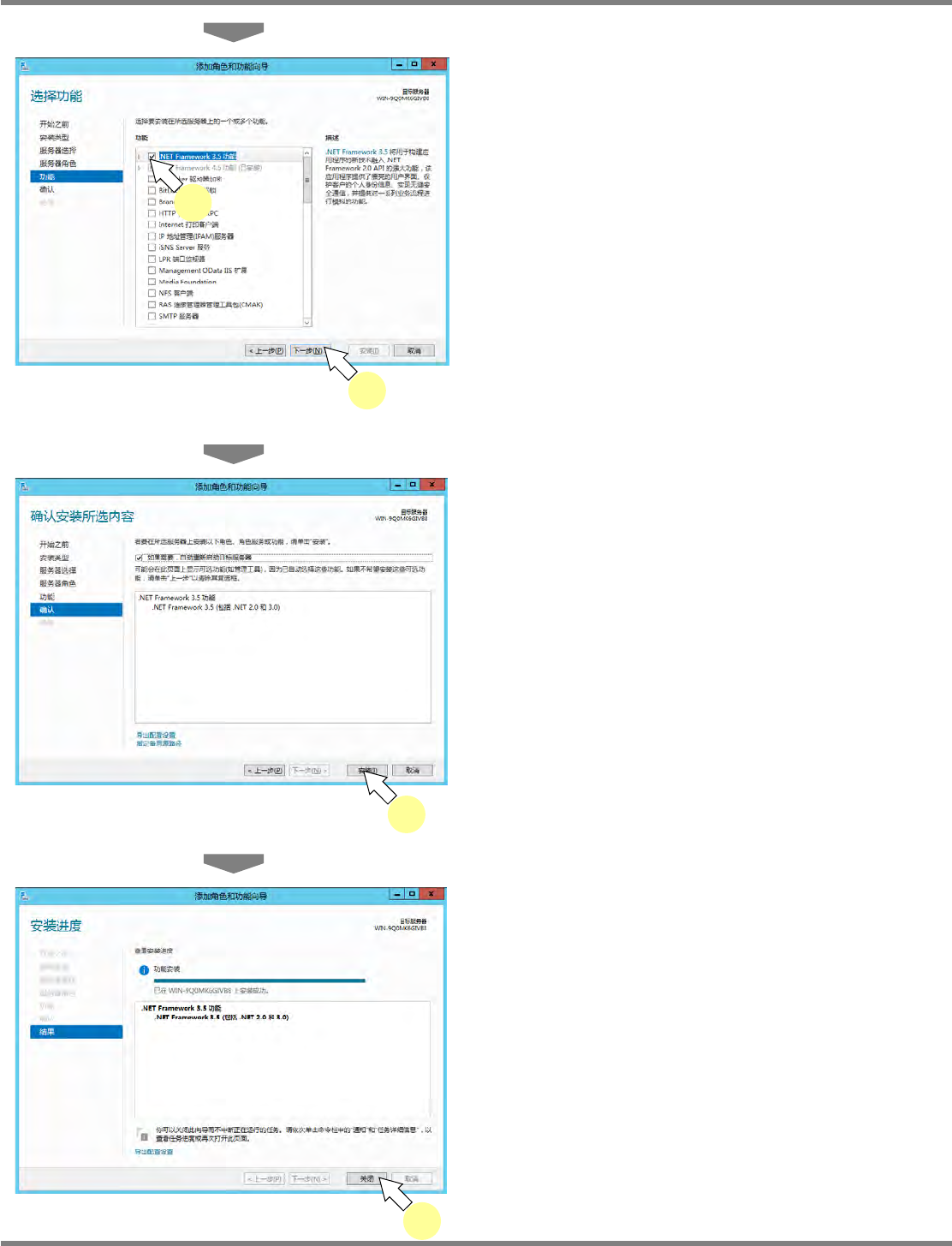 NPM-DGS 程序手册 2.1 NPM-DGS 的安装 Page 2-8 EJS9AC-MB-02P-21 8 勾选 [.NET Framework 3.5 Features] 。 9 点击 [ 下一步 ] 。 10 点击 [ 安装 ] 。 11 点击 [ 关闭 ] 。 Install020101S-7 2C00 10 Install020101S-7 3C00 11 Install020101S-7 1C00 9 8