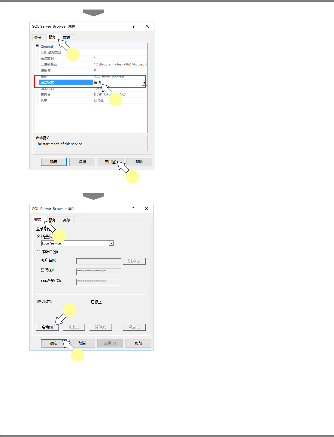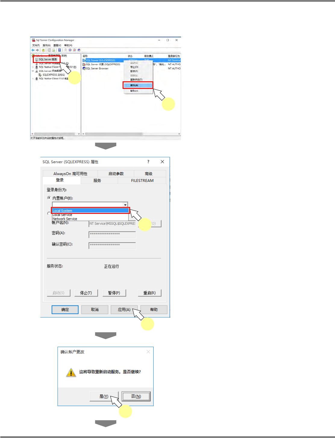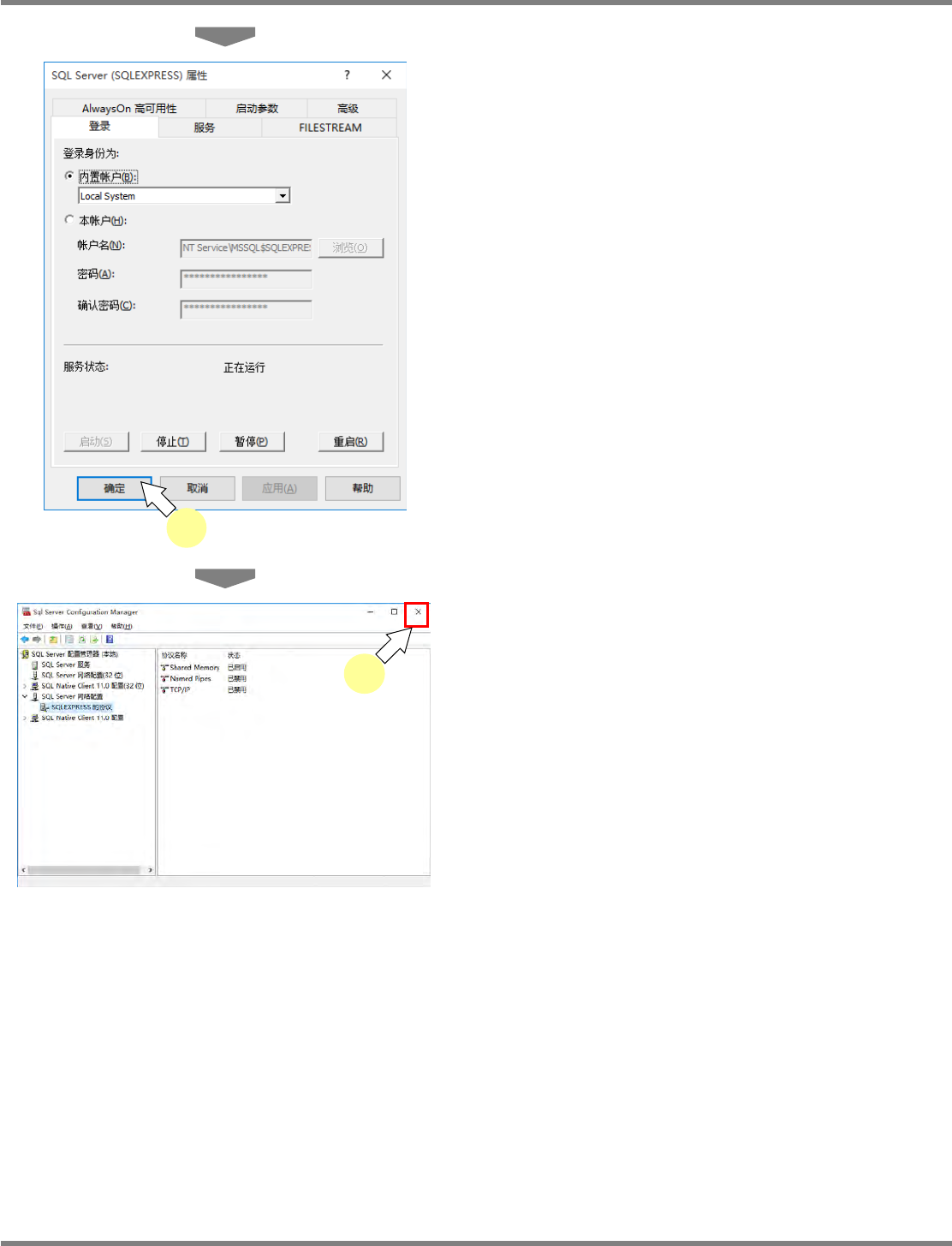 NPM-DGS 程序手册 安装以及设定 EJS9AC-MB-02P-21 Page 2-49 ⑤ 变更 SQL Server (SQLEXPRESS) 的登录设定 如果版本为 10.05.00 之后的版本,则无需本项设定。 1 选择 ‘SQL Server 服务 ’ 。 2 在 ‘SQL Server (SQLEXPRESS)’ 上右 击,然后点击 [ 属性 ] 。 3 将 [ 登录 ] 选项卡的 ‘ 内置帐户 ’ 变更为 ‘Loc…