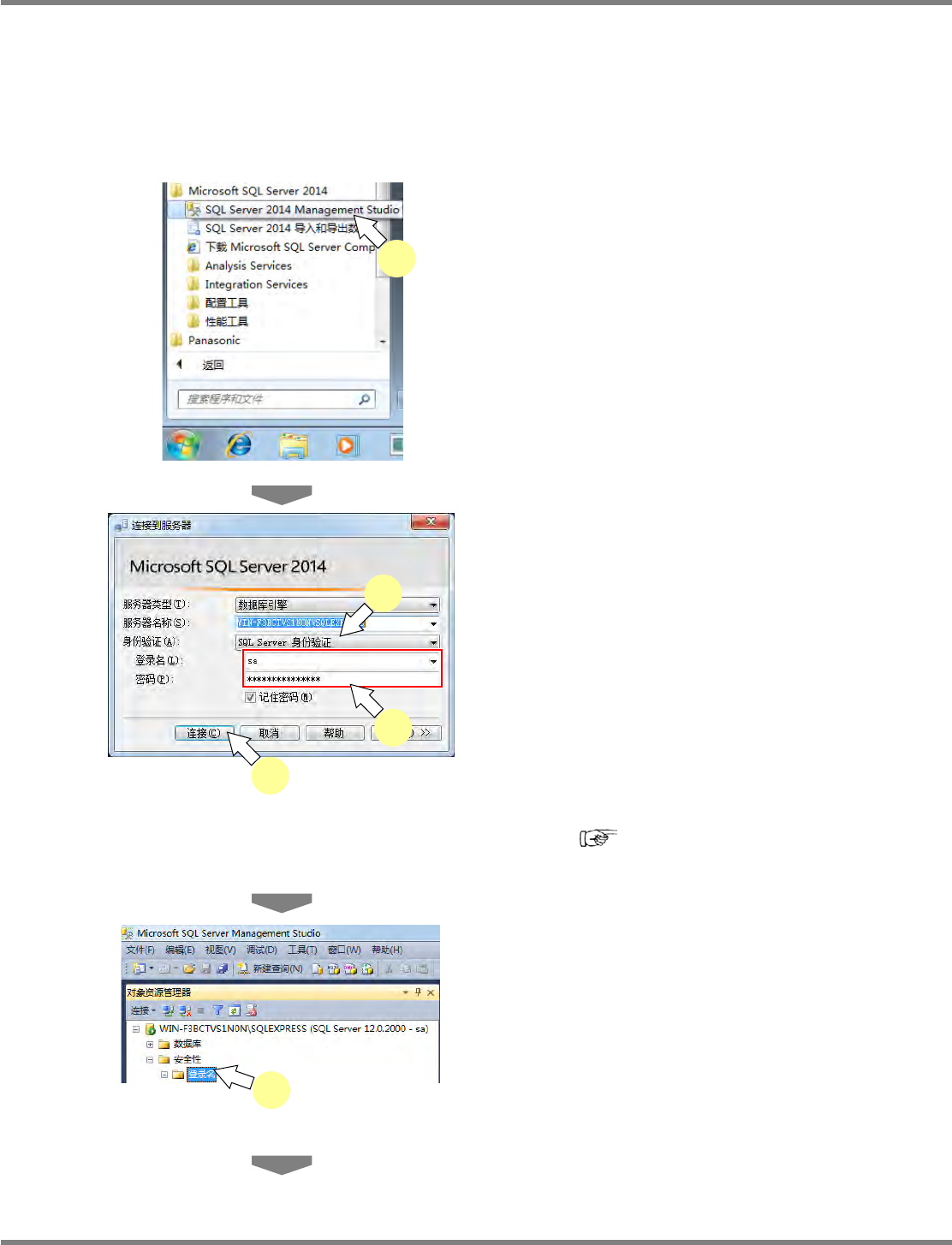 NPM-DGS 程序手册 安装以及设定 EJS9AC-MB-02P-21 Page 2-51 2.1.10 SQL Server 的登录信息设定 DGS 用登录信息的追加 为了连接 SQLServer 数据库,追加登录信息。 1 选择 [ 开始 ] [ 程序 ] 后, 打开 [Microsoft SQL Server] → [SQL Server Management Studio] 。 2 在 ‘ 身份验证 ’ 下, 选择 […