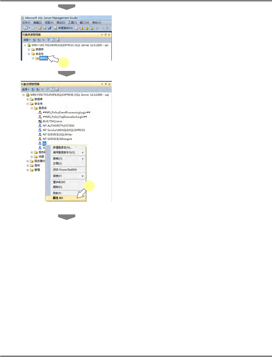 NPM-DGS 程序手册 2.1 NPM-DGS 的安装 Page 2-54 EJS9AC-MB-02P-21 4 通过对象资源管理器, 选择 [ 安全性 ] [ 登录名 ] 。 5 从登录名一览中选择 ‘sa’ 后, 在右击菜 单上选择 [ 属性 ] 。 Install020210S-0 3C00 4 Install020210S-0 7C00 5