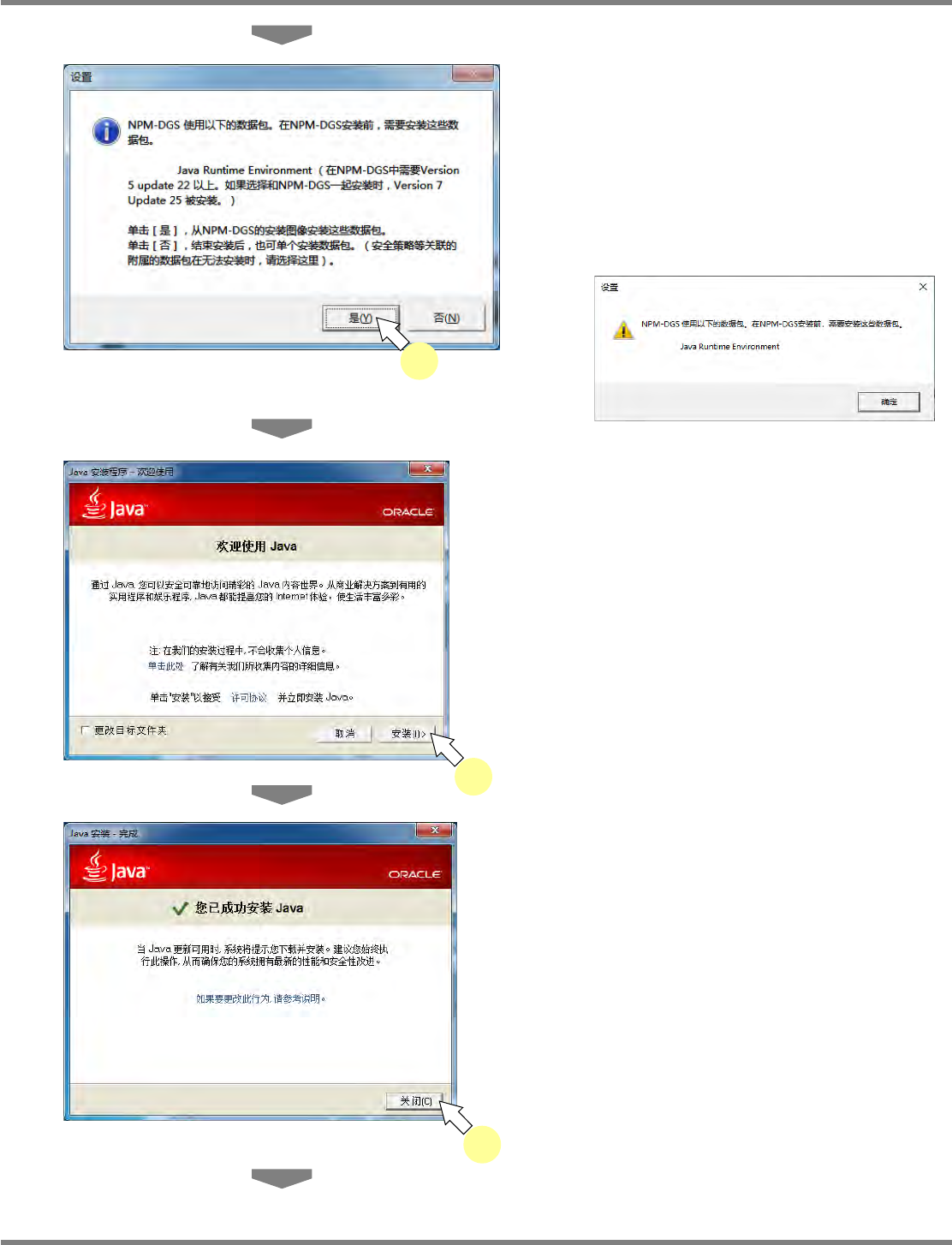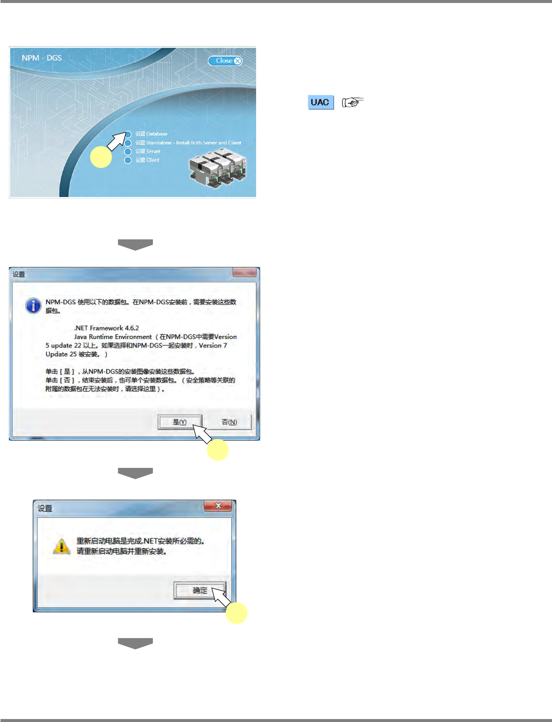 NPM-DGS 程序手册 2.1 NPM-DGS 的安装 Page 2-58 EJS9AC-MB-02P-21 ① DGS 数据库的安装 1 在放入 CD-ROM 后自动再生的画面上 选择 ‘ 设置 Database’ 。 ( ‘1.3.1 关于用户帐户控制 ’) 安装 DGS V10.09.00 以上版本,需要 .Net Framew ork4.6.2 。 2 点击 [ 是 ] 。 既已安装时,跳到步骤 4 。 只在安…