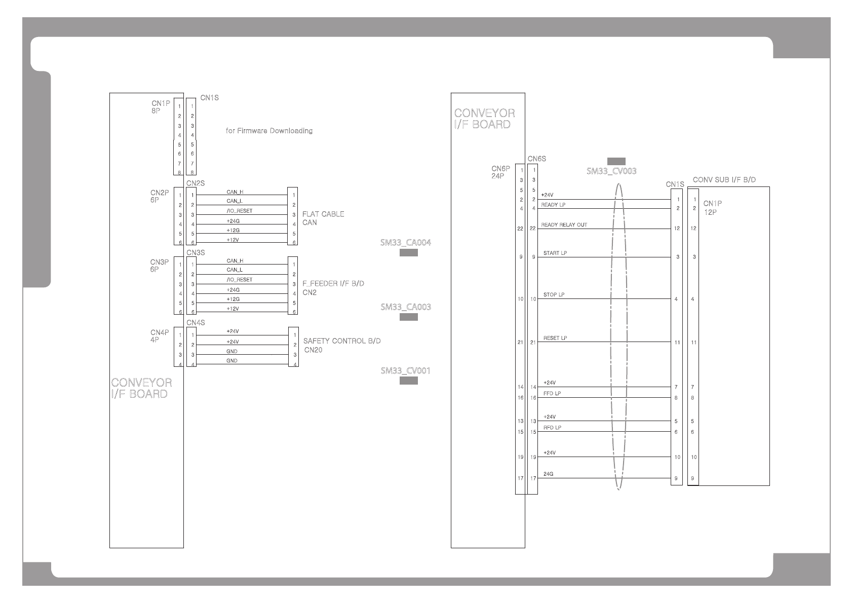 Page HANWHA TECHWIN 11 8 SM411F Conveyor Board Interface (1/5) 1 3 2 1 3 2 I/ F B O AR D + 24V GN D GN D + 24V /I O_ R E SE T + 24G + 12G + 12V CA N _H CA N _L CA N _H CA N _L /I O_ R E SE T + 24G + 12G + 12V 4 5 6 4 5 6…