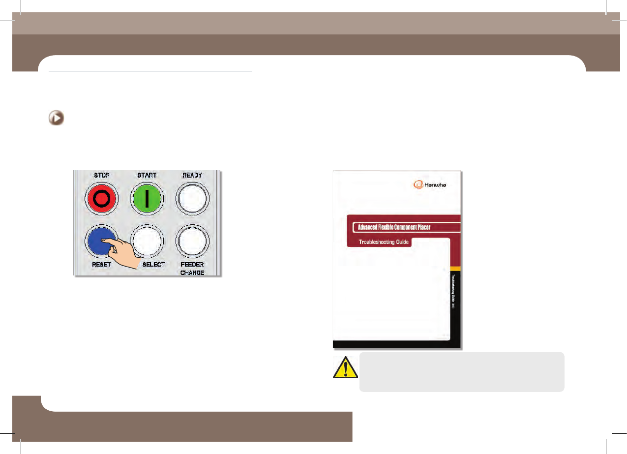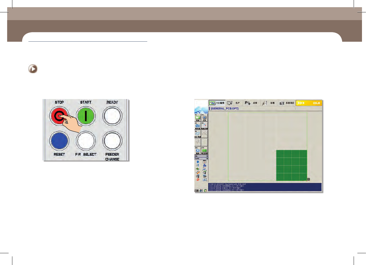 生产过程中的检验事项 Chap ter 4 Nex t Generation, Multi - Functi onal Placer DE CAN S 1 Op e ra tio n Ha n db oo k 4-1 6 本 Chapter 主要介绍检验生产中错误或其他事项并采取措施时的设备暂停方法(继续/开始 模式) , 异常停止方法( 人为/系统异常停止) , 异常停止后系统重启方法等 紧急 停 止 > 系 统异 常停 止 :…
