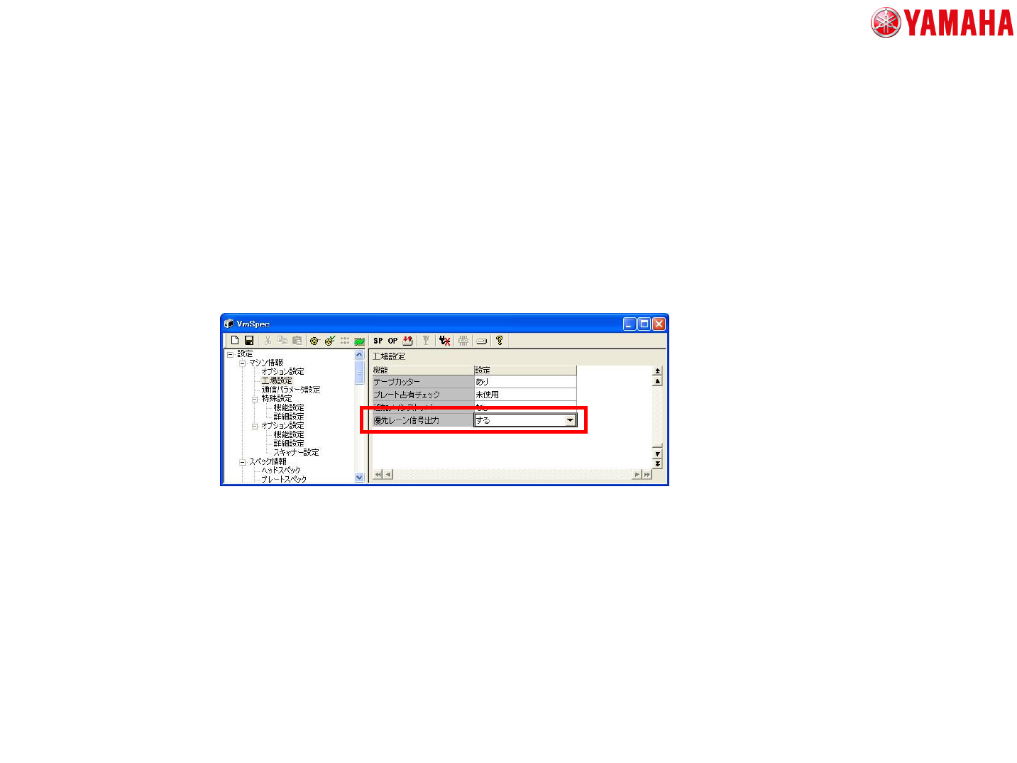 • マシン設定→工場設定→「優先レーン信号出力」項目を「する」に設定する。