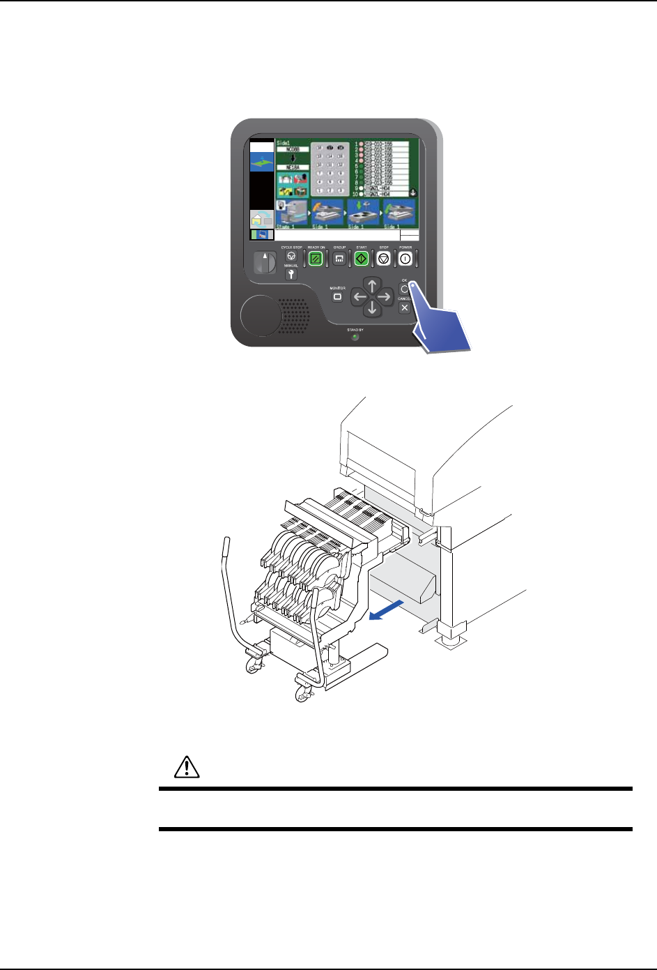 SYS-AIMEX-9.0S 4. 生产准备 AIMEX 系统手册 85 4.9.2 吸嘴的卸下和安装 请将要进行吸嘴更换的一侧的操 作权变成有效,然后进行以下的作 业。 1. 请按下操作面板的 OK 按钮。 2. 慢慢地卸下被松开的料站托架或料 盘单元 -LT。 3. 请打开正面门。 注意 打开正面门的时候,请完全向上打 开。如果将正面门停止在中途位置 ,有 可能落下。 30SYS-0785 LOCK ENABLE Module 1 …
