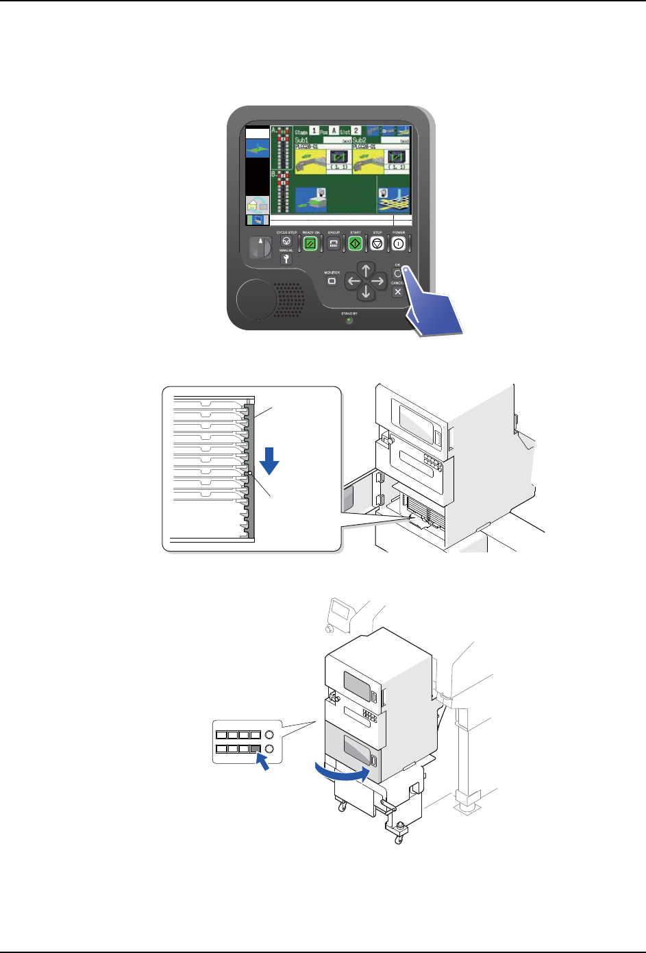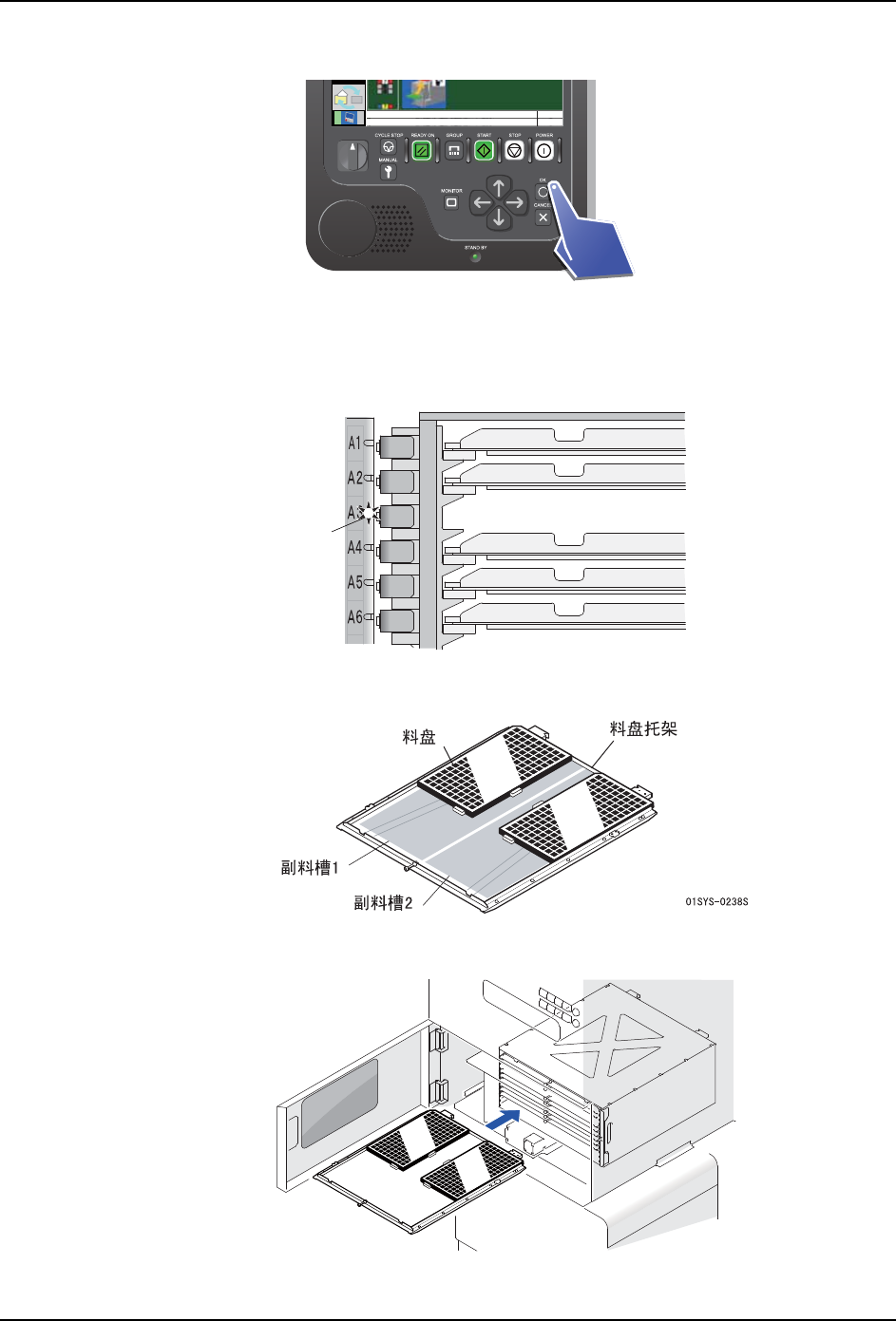 5. 生产 SYS-AIMEX-9.0S 132 AIMEX 系统手册 4. 请按下操作面板的 OK 按钮。 将料盘元件插入料槽内 1. 请确认要补充的料槽。需要补充的 料槽的 LED 亮灯着。另外,对于向导画面上所选 择的 料槽,LED 闪烁着。 2. 将料盘安装到料盘托架上。 3. 将料盘托架安装到对象料槽上。 备注 )在将料盘放置到料槽时,请轻轻放置以免产生冲击。 30SYS-0789 LOCK ENABLE 12 01SYS-0…