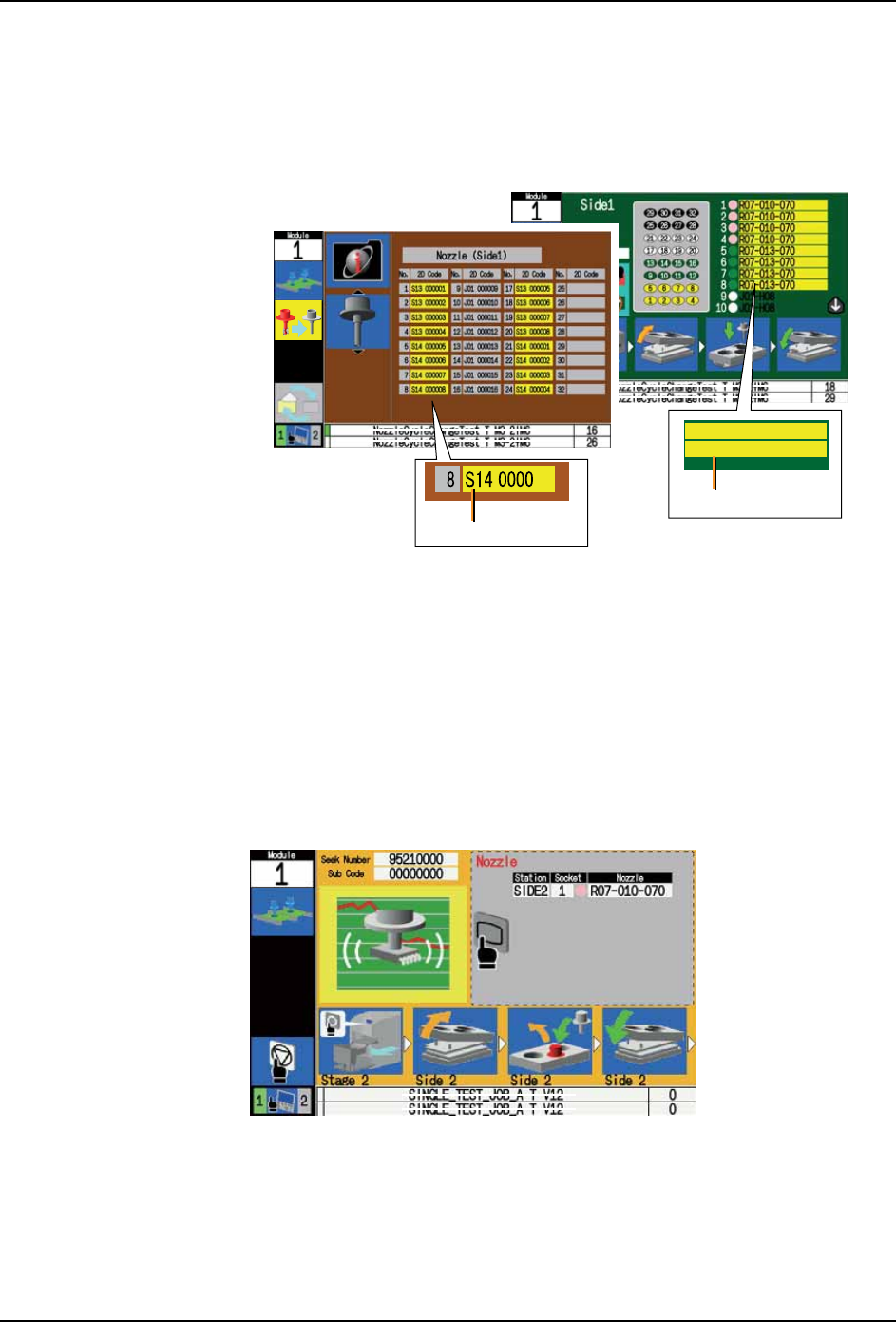 2.在手动模式的信息指令及换线时的安装向导中,被切换的吸嘴的代码或别名以黄色