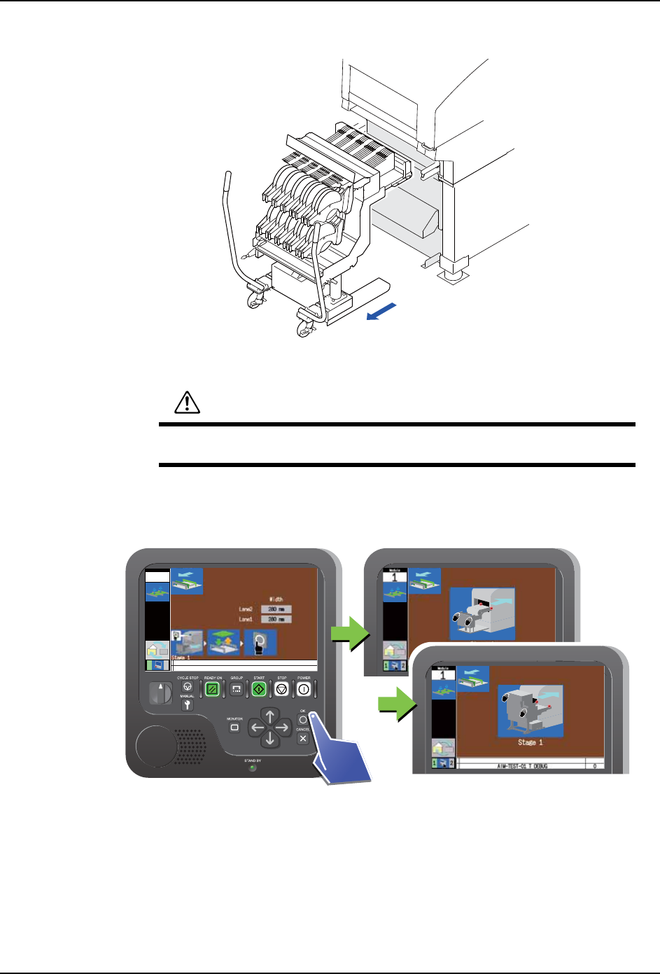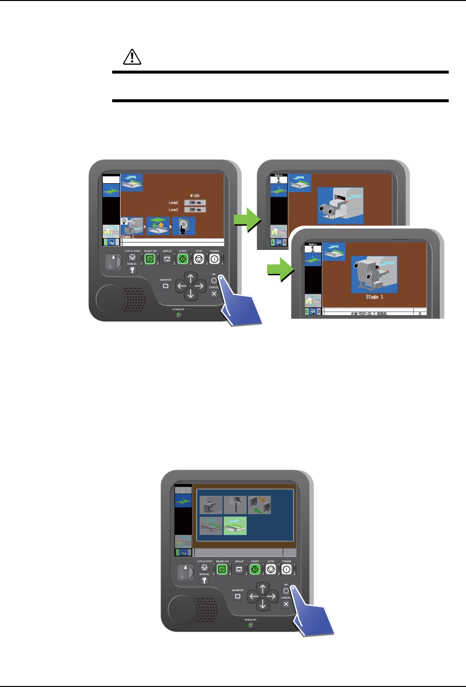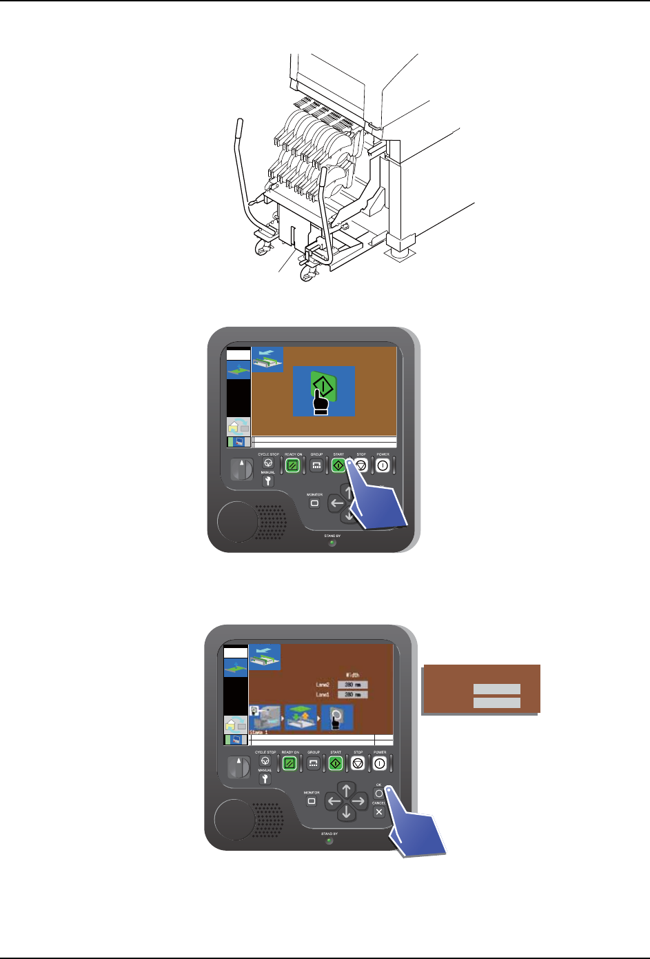 SYS-AIMEX-9.0S 7. 手动模式指令的操作 AIMEX 系统手册 231 备注 )如果要使用 PCU 卸下料站托架时,请将 PCU 安装在机器上。 2. 显示支撑 板更换 STAR T 等待画面。请按下 START 按钮。 备注 )通过该操作,搬运轨道向侧面 1 方向前移,通道 2 的从属导轨移动到侧面 2.。 3. 显示作业向导。请按下 OK 按钮。 30SYS-0275 PCU 30SYS-0308 LOCK ENABL…
