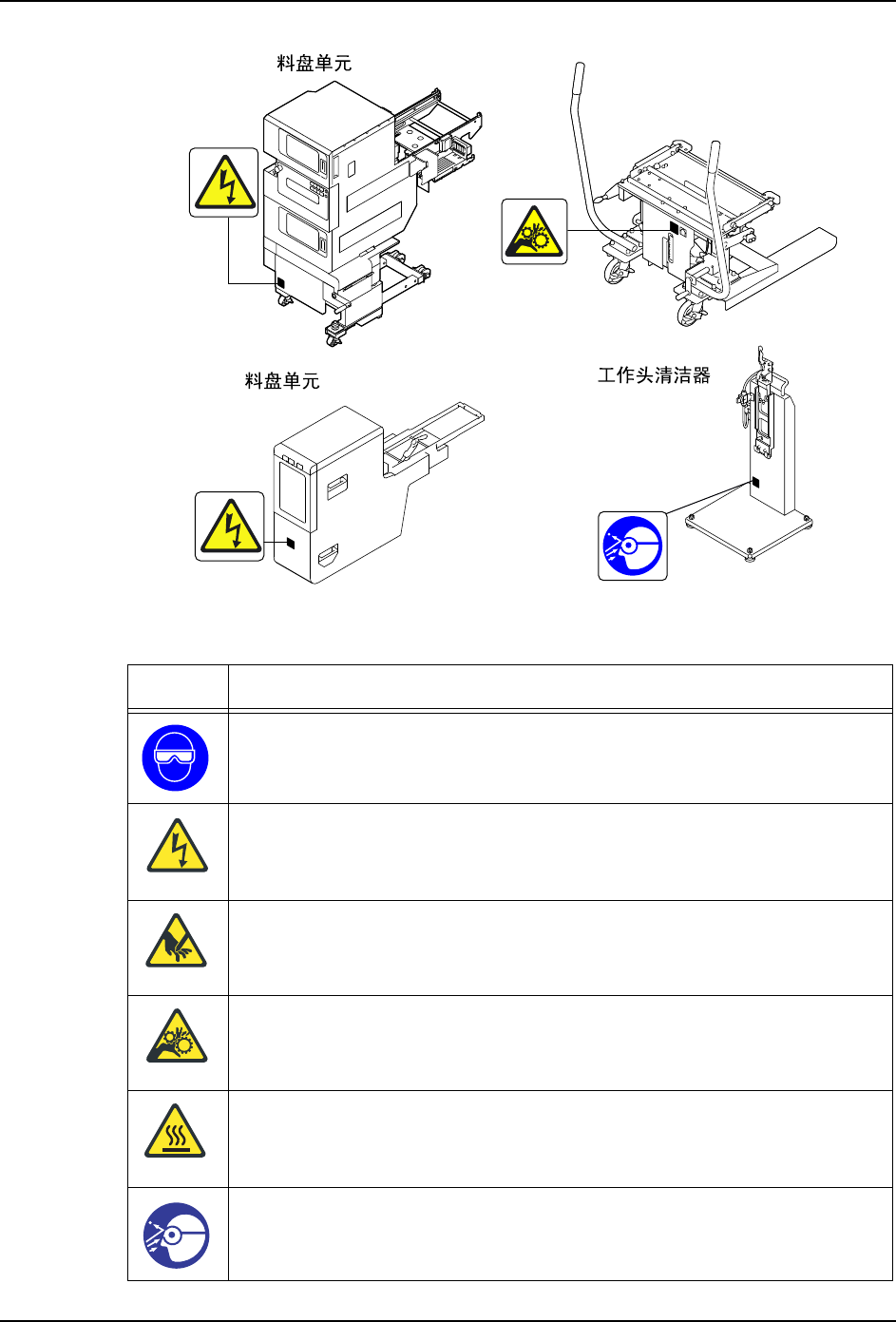 ·手指有可能被夹在料盘单元 -M 与料站托架之间而受伤。