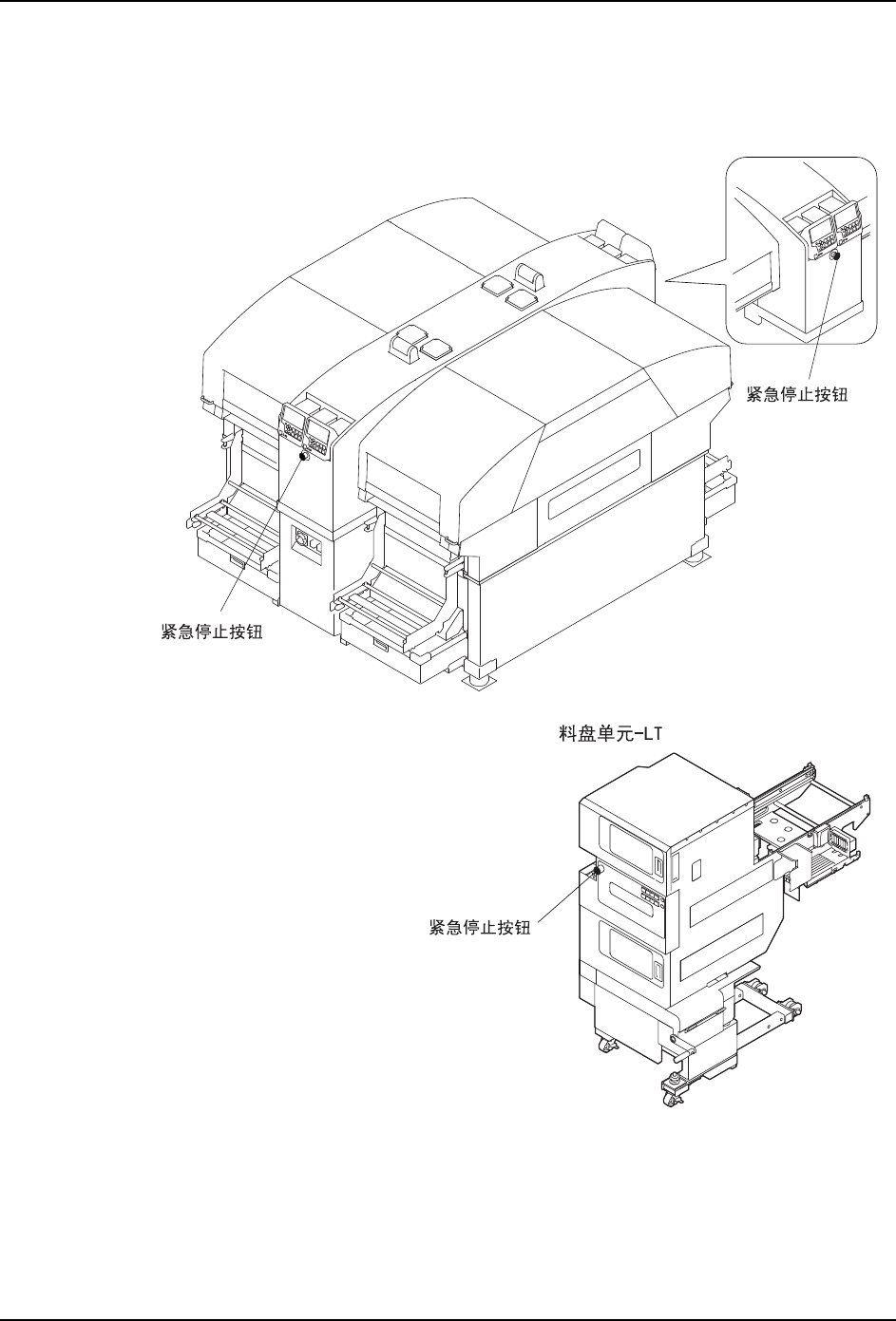 发生紧急情况时,请按下机器上红色的紧急停止按钮停止机器运转。紧急停止按钮的位置请