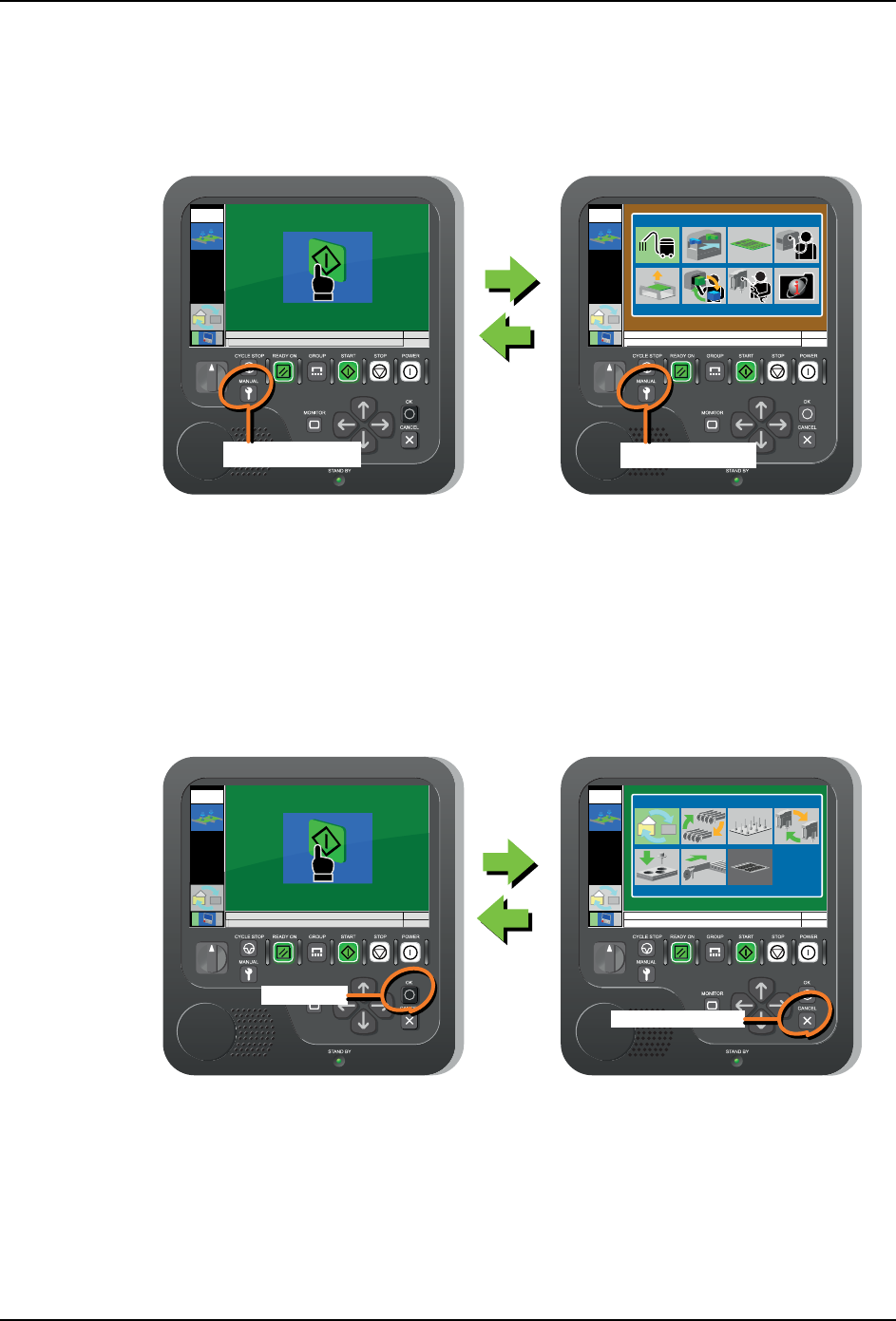 3. 基本操作 SYS-AIMEX-9.0S 28 AIMEX 系统手册 3.3 显示手动指令模式画面 在显示开始等待画面期间按下 MANUAL 按钮后,就会显示手动指令模式画面。 手动指令使用 在维修保养等非生产作业的时候 。 在显示手动指令模式画面期间再次按下 MA NUAL 按钮,画面就会恢复到开始等待画面。 手动指令的说明请参照 "7. 手动模式指令的操作 "。 3.4 显示换线菜单画面 在显示开始等待画面期…