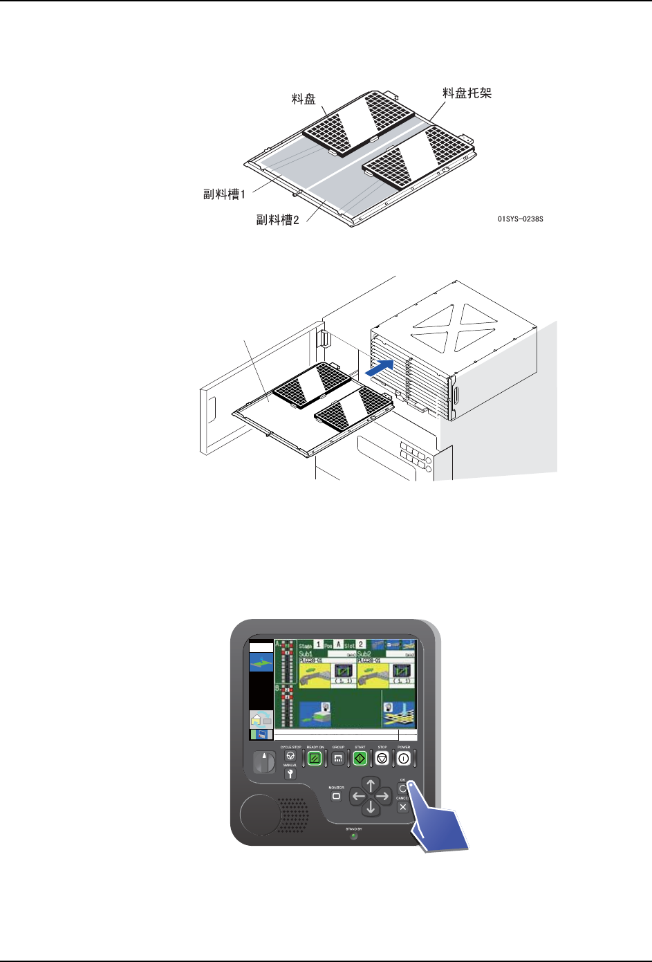 注意 )在将料盘托架安装到料盘箱内时,在不产生冲击下将料盘托架放入最里面。