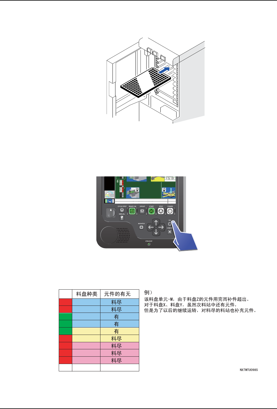 a. 此时,不仅是出现停止原因的料槽,对于其他的料槽,如果料尽,也请安装新的料